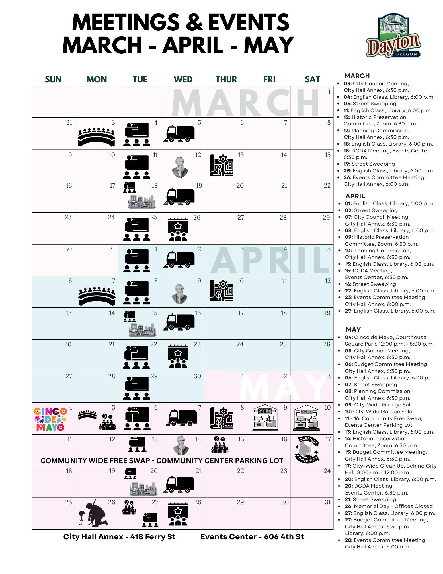 Public Works is busy with a number of tasks, including fire hydrant flushing, water line blow-offs, catch basin cleaning, and street sweeping. Additionally, preparations for spring events like the City Wide Clean Up and Swap are underway. Dates for these events will be advertised as they approach.