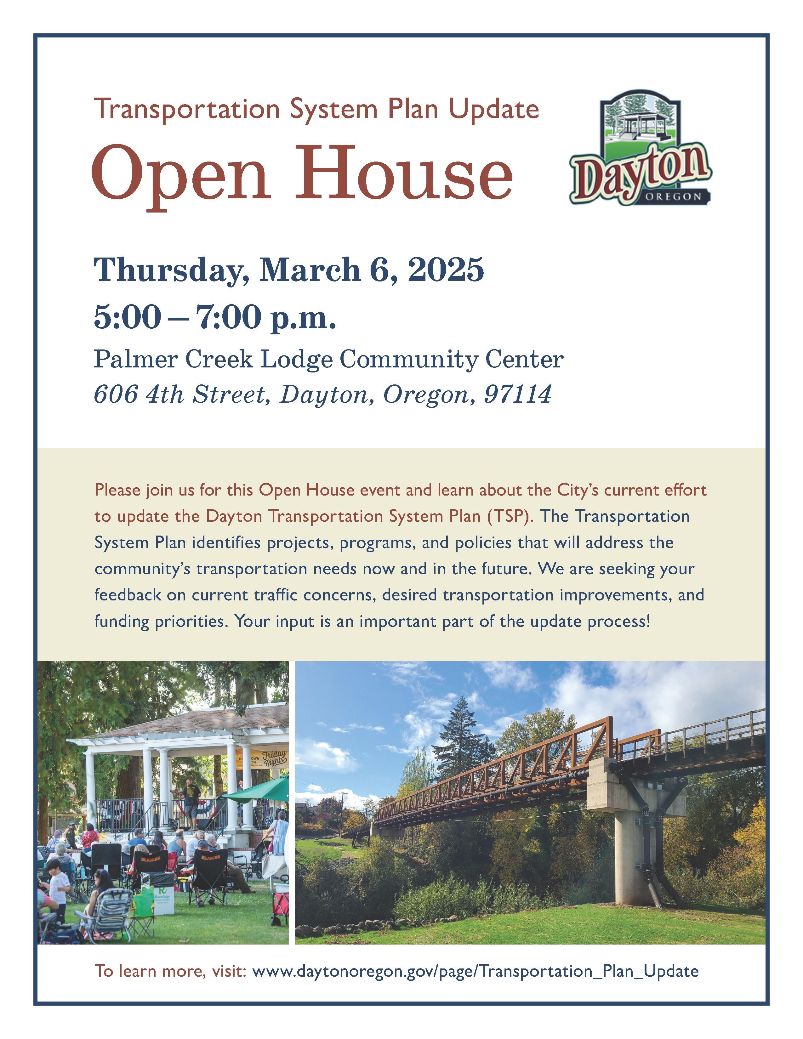 With grant assistance, we recently completed a housing analysis study that will assist us in updating our housing needs for the next 20 years. Our open house held this past October gave the community the opportunity to comment on direction as we work toward updating our comprehensive plan. We received a grant to update the city’s Transportation System Plan (TSP). We have been working with DKS Associates to identify projects, programs, and policies that will address the community’s transportation needs for now and in the future. To seek feedback on current traffic concerns, desired transportation improvements, and funding priorities, we will be hosting an Open House Thursday, March 6 from 5 pm to 7pm at the Community Center. Join us to learn and comment about the City’s current effort to update its TSP.