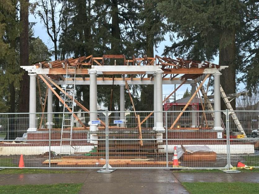 Repairs are underway for the bandstand at Court House Square Park. The site will be active with construction, and there will be equipment in use. The public is asked to give the crew space to complete this work.