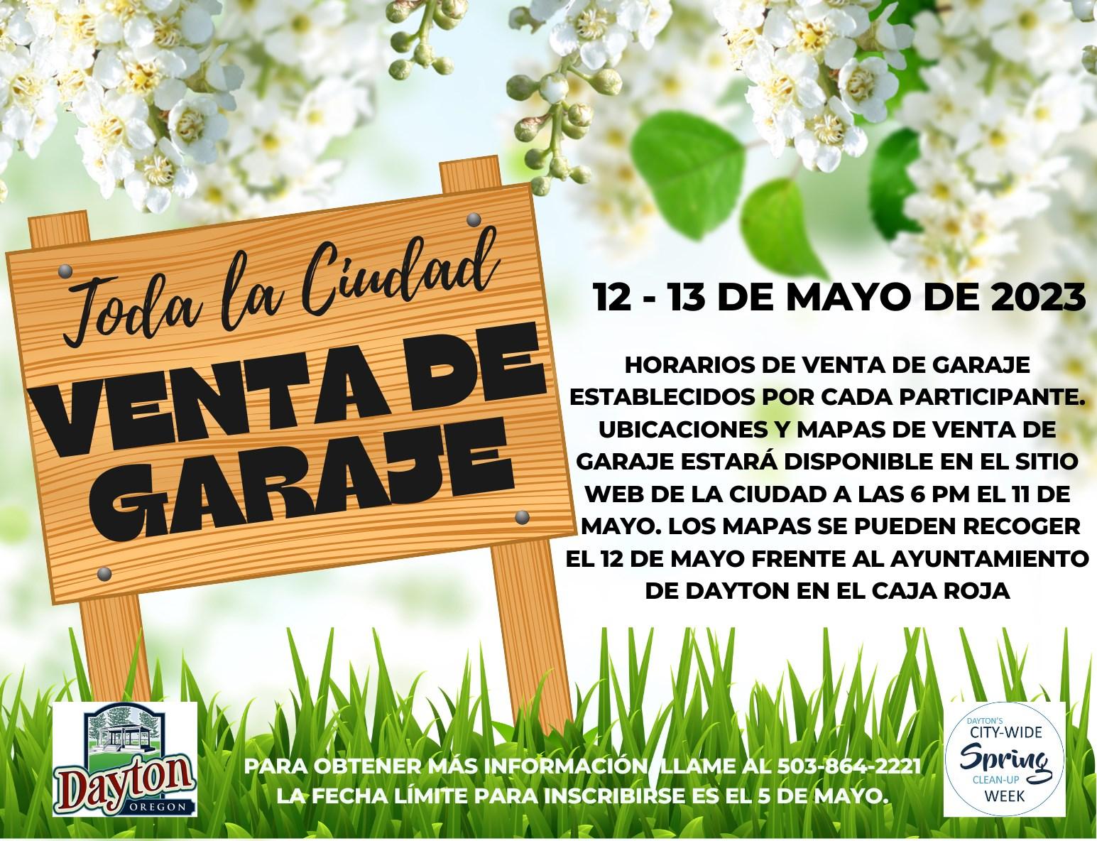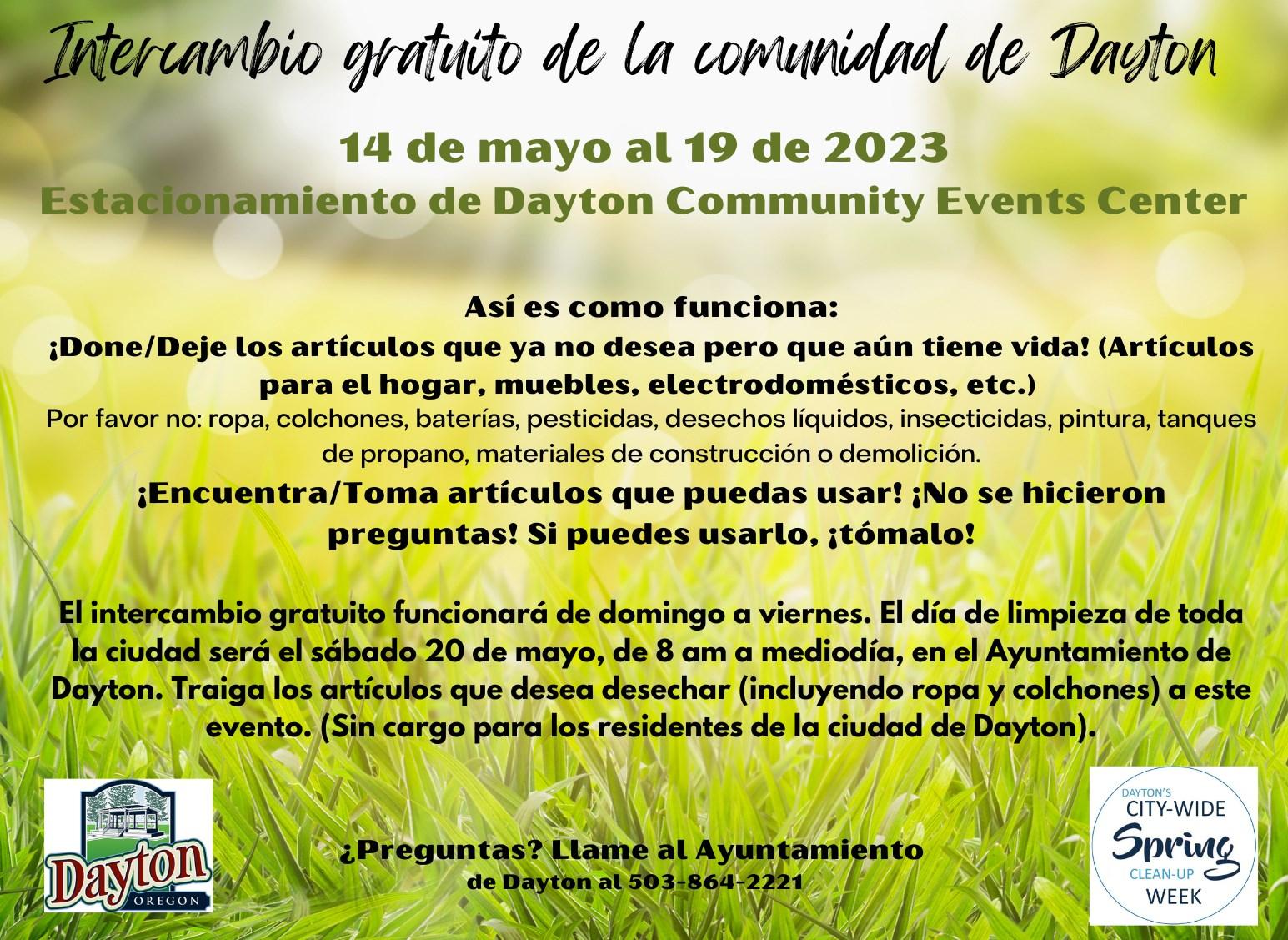 Se instalará una nueva estación de bombeo de alcantarillado cerca del puente HWY 221 que se dirige hacia Grand Island. Este es un proyecto de $ 1.2 millones financiado en su totalidad a través de subvenciones de la Ley del Plan de Rescate Estadounidense de 2021. La ciudad recibió una subvención de $ 511k a través del programa de subvenciones ARPA del condado de Yamhill que se ha equiparado con la asignación directa de fondos ARPA del gobierno federal a Dayton. En mayo, la segunda semana anual de limpieza de primavera en toda la ciudad de Dayton comenzará con una venta de garaje en toda la ciudad los días 12 y 13 de mayo. Si está interesado en tener una venta de garaje en su casa, llame al Ayuntamiento al 503-864-2221 para registrarse. Proporcionaremos un mapa para visitantes y publicidad del evento en el Registro de Noticias y en línea. Después de la venta de garaje, el Intercambio Gratis de la Comunidad de Dayton comienza en el estacionamiento del Centro Comunitario (Palmer Creek Lodge). La gran carpa blanca estará levantada. Puede traer cualquier artículo que no haya vendido en su venta de garaje al intercambio. Estaremos aceptando artículos de segunda mano que todavía son útiles. No estamos aceptando ropa en la carpa este año (la ropa lavada se puede donar en la Iglesia Bautista). El intercambio gratuito se llevará a cabo hasta el viernes 19 de mayo, seguido de la limpieza de toda la ciudad el sábado 20 de mayo de 8 am al mediodía en el Ayuntamiento de Dayton. Esto es gratis para los residentes de Dayton. Para obtener más información sobre qué artículos se aceptan para el Intercambio gratuito y el Día de limpieza, visite la página de eventos en www.daytonoregon.gov.