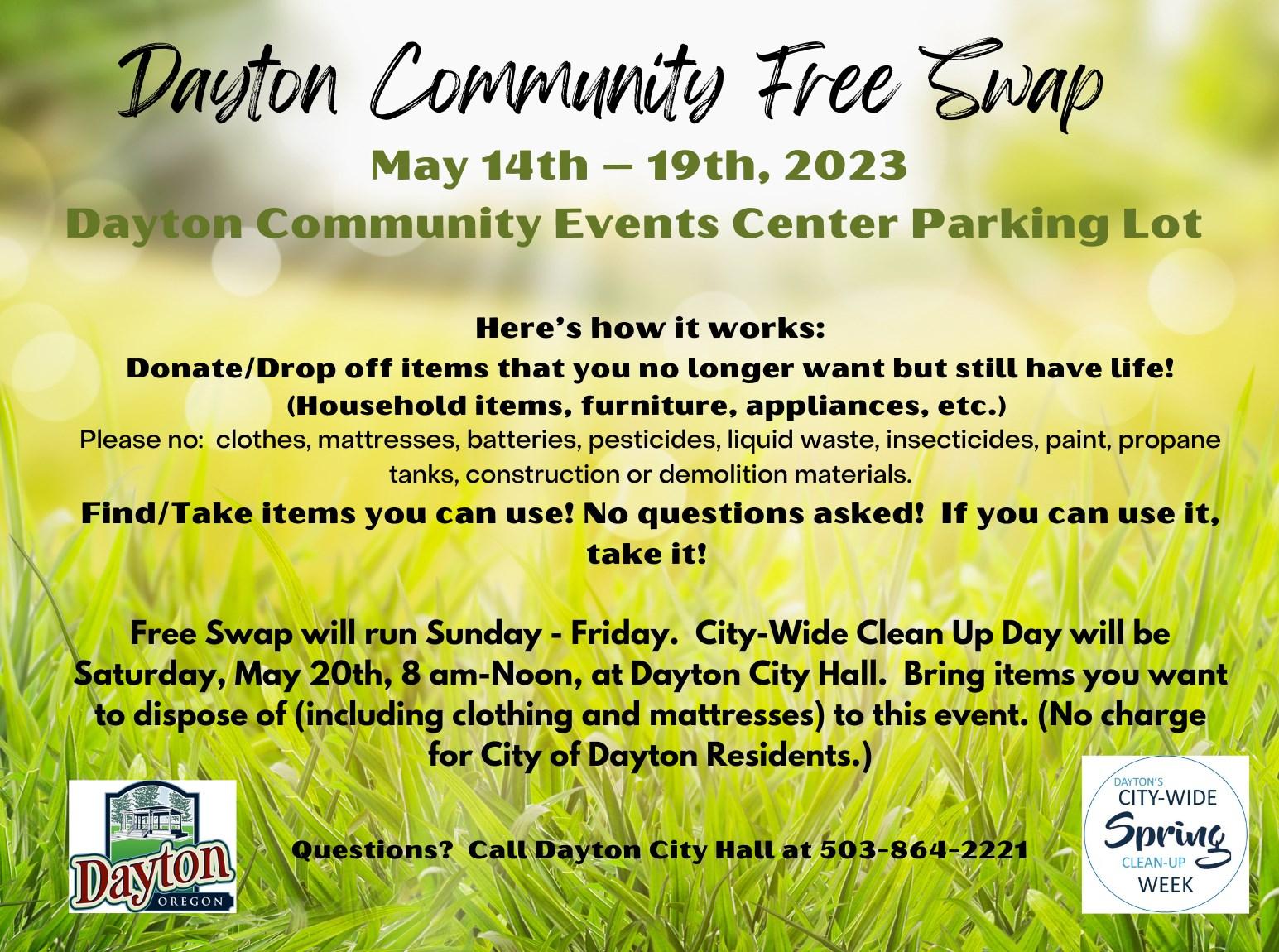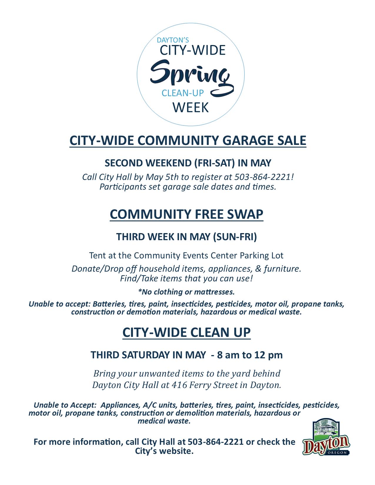 In May, the second annual Dayton City-Wide Spring Clean-up Week with begin with a citywide garage sale on May 12th and 13th. If you are interested in having a garage sale at your home, please call City Hall at 503-864-2221 to sign up. We will provide a map for visitors and advertising of the event in the News Register and online. Following the garage sale, the Dayton Community Free Swap begins at the Community Center (Palmer Creek Lodge) parking lot. The big white tent will be up. You are welcome to bring any items you did not sell at your garage sale to the swap. We’ll be accepting second hand items that are still useful. We are not accepting clothing at the tent this year (washed clothing can be donated at the Baptist Church). The Free Swap will run through Friday, May 19th followed by the City-Wide Clean Up on Saturday, May 20th from 8 am to Noon at Dayton City Hall. This is free for Dayton residents. For more information on what items are accepted for the Free Swap and the Clean Up Day, please visit the events page at www.daytonoregon.gov.
