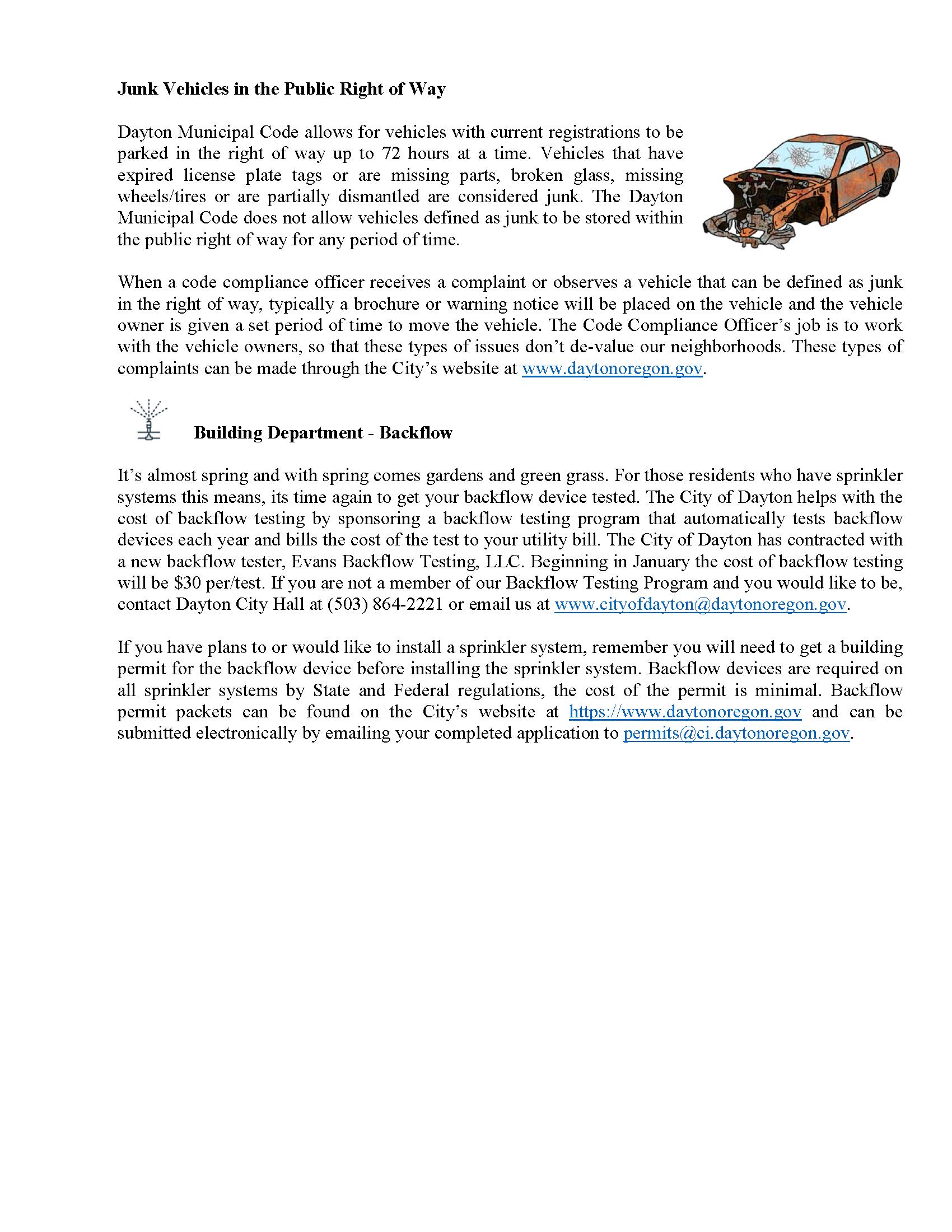As always, please feel free to contact me for any questions or concerns. I can be reached at 503-864-2221 or via email at rroaden@daytonoregon.gov.