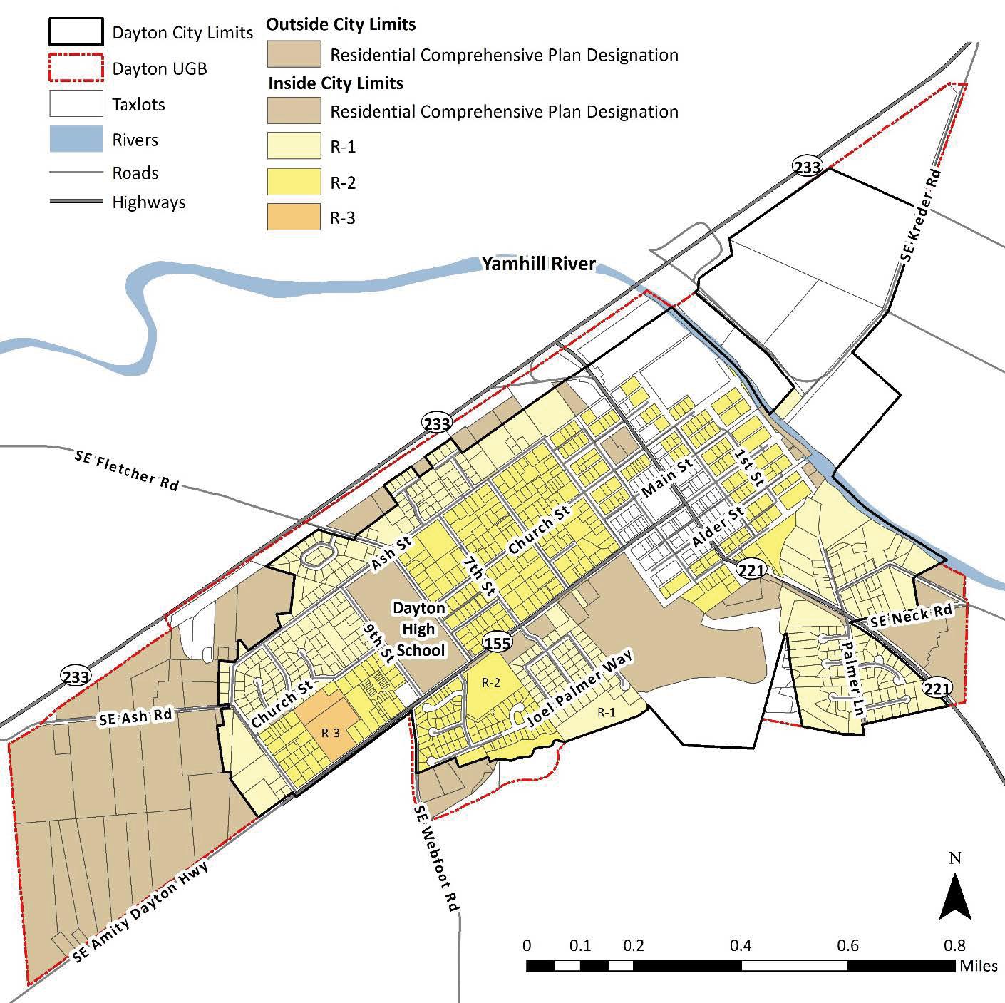 This means that Dayton should look at expanding housing opportunities within the single-family (R-1) zone and expanding middle housing options to meet the growing needs of the community. Additionally, Dayton should consider expanding the R-2 and R-3 zones.