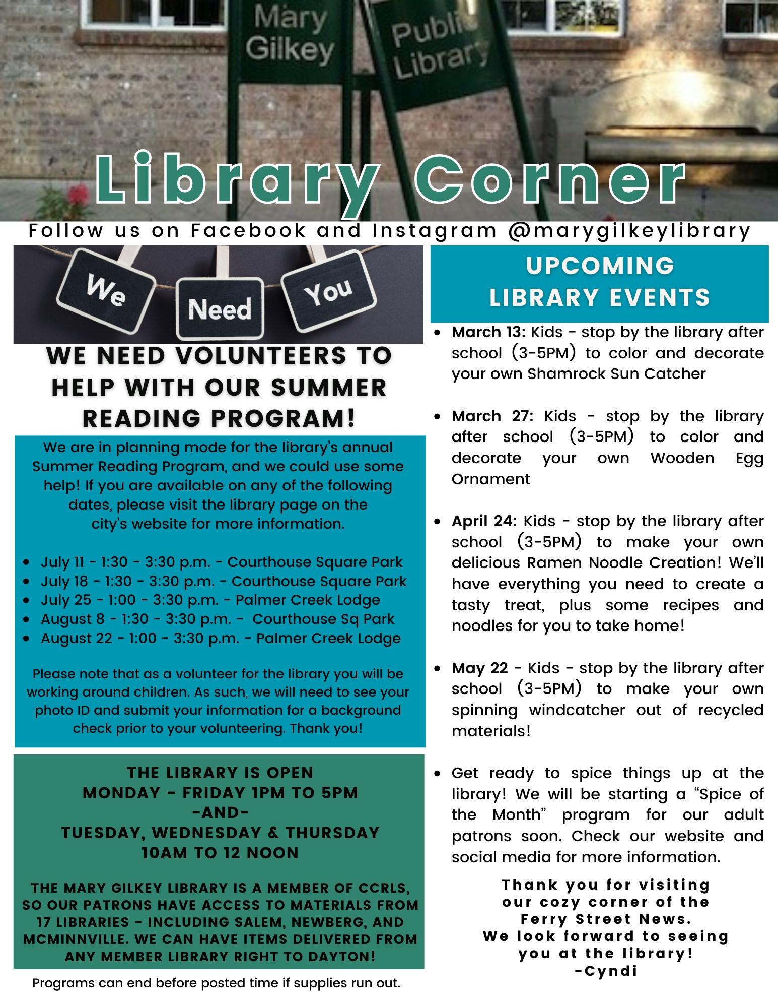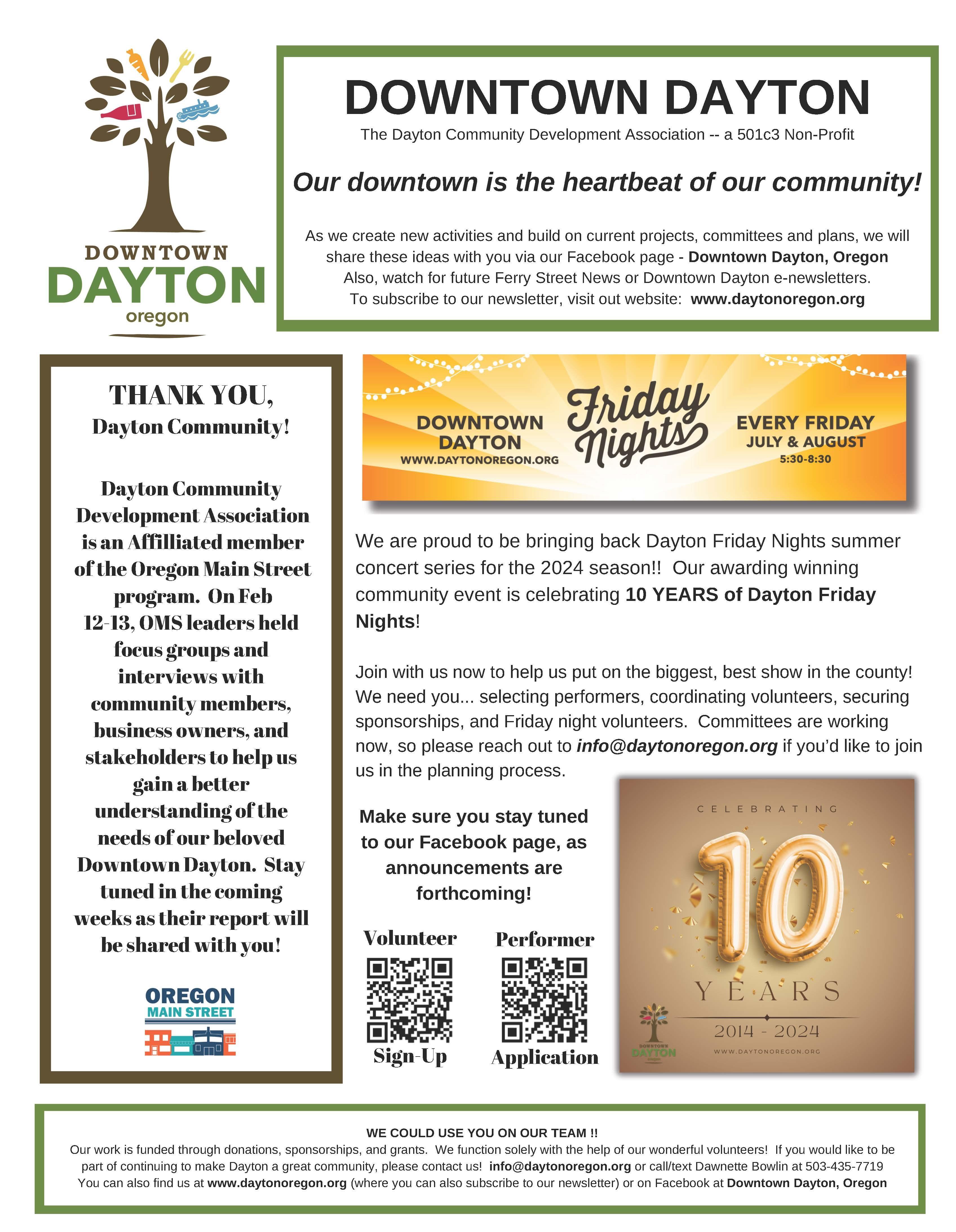 Lastly, we are working on a grant application to be submitted to the Oregon Parks and Recreation Department this spring. This “Local Government Grant Program” offers applicants the ability to secure funding for planning efforts. Dayton needs to update its Parks and Recreation Master Plan (last updated in 2004). Master plans are used to not only identify future projects but also support funding requests to build identified projects. We are hopeful the state will look favorably upon our application.