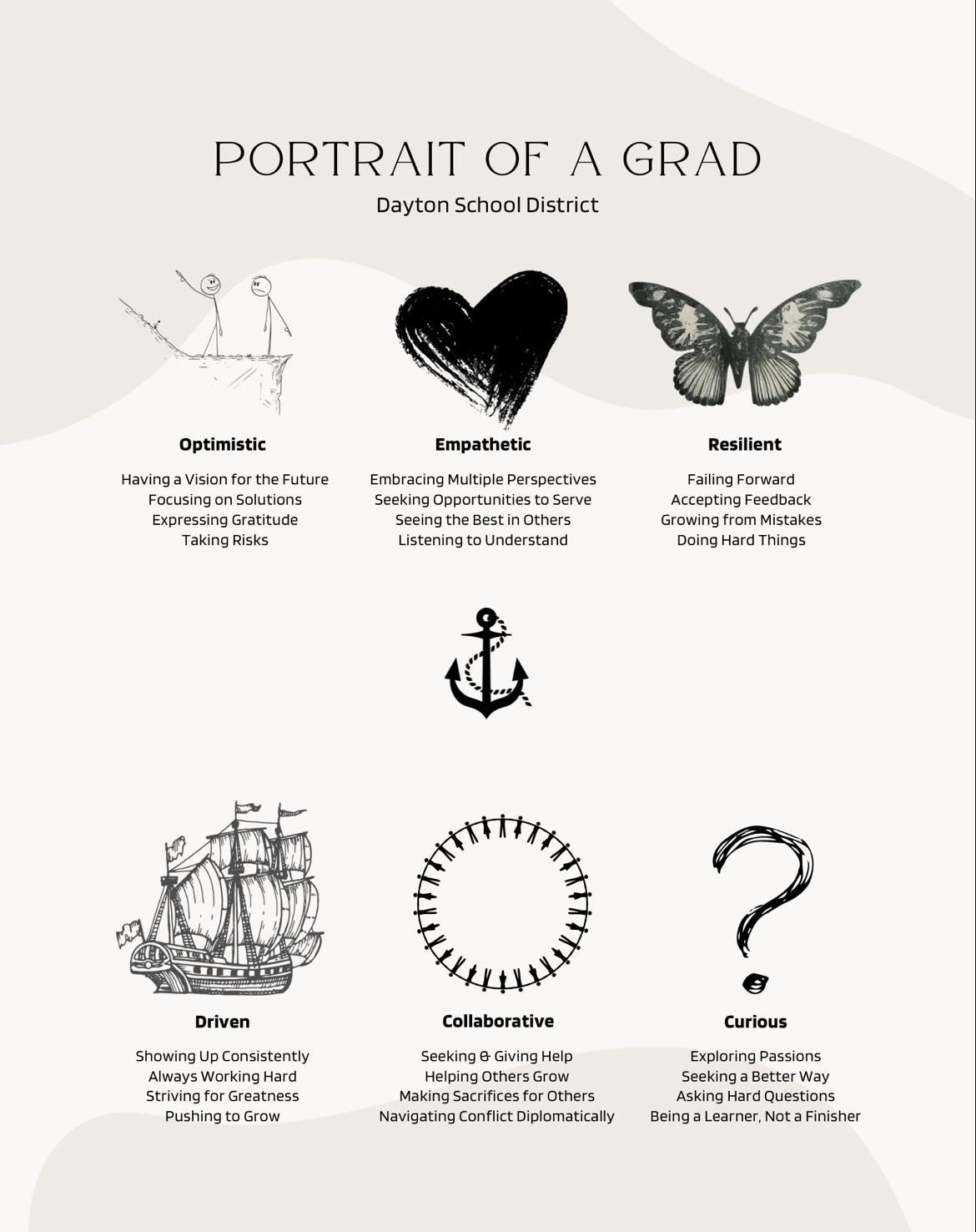 It’shardtobelievethatDaytonSchoolDistrictisalreadyafewweeksintosemestertwo.These pastsixmonthswehavebeenworkinghardasanentirecommunitytoanswerthequestion, “Whatskills,mindsets,dispositions,andtraitsdowemostwantourstudentstopossesswhen theycrossthatstageattheendoftheirsenioryear?”Afterunpackingthisquestionthrough staffmeetings,studentsurveys,communityforums,and parentinput,wehavesynthesizedthevoicesofourstakeholdersandcreatedour“PortraitofaDaytonGrad.”
