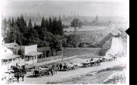 In this photo, see the bridge in the far-right corner. Farmers wait to unload produce at the warehouses for shipping to Portland. Rossner’s Saloon is the building at the left edge of photo.