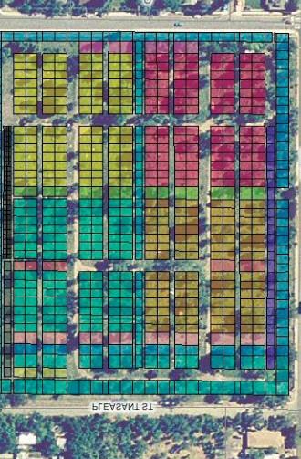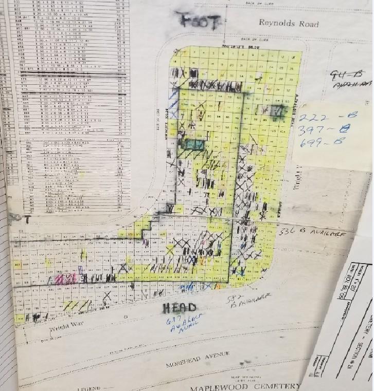 To the right represents a current paper map that is being used at Durham’s Maplewood Cemetery. This map is used to identify available plots and is updated by hand. Because the map is not tied directly to a database, a separate verification of the plot’s status in NEXUS must be made as well.
