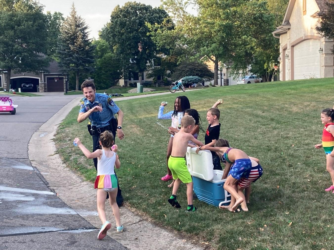 Reserve Officer Cole Pixley playing in a water balloon game at this year’s Night to Unite neighborhood celebration.