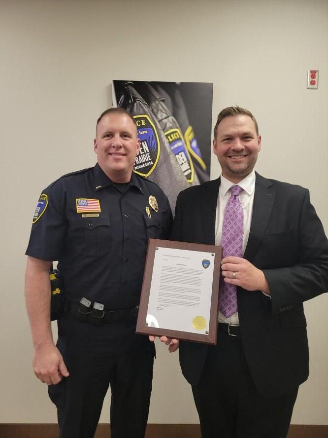 Traffic remains one of the top concerns for Eden Prairie residents. In 2024, the department issued 6,240 written warnings for traffic violations up 26% from 4,947 warnings in 2023. Officer Hunter Fricke (below) received an award from the Minnesota Department of Public Safety for his arrest of two teenage drivers who were racing each other on Hwy. 212 at nearly 100 MPH. Both vehicles had passengers and neither driver had a drivers license.