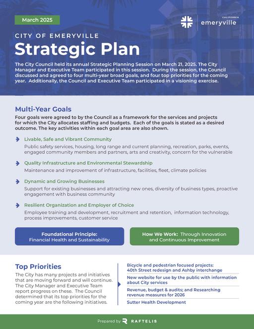 Guided by our City’s Strategic Plan, we continue to advance initiatives that strengthen Emeryville’s quality of life From improvements in recreational facilities to expanded programming for youth and families, our progress reflects our shared vision for a community that is healthy, vibrant, and resilient These updates are made with the input of our residents and with a focus on building for the future