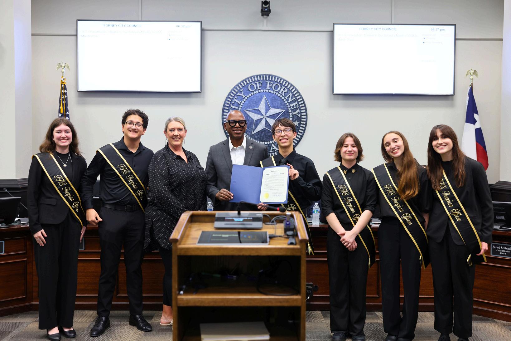 Mayor Jason Roberson and the Forney City Council presented a proclamation recognizing March as Theatre In Our Schools Month (TIOSM) to Forney High School Troupe 4123. Thespian Officers Addisyn, Joshua, Ethan, Rowan, Alysse, and Laura were present to accept the proclamation along with their director, Missy Lyda. Congratulations!