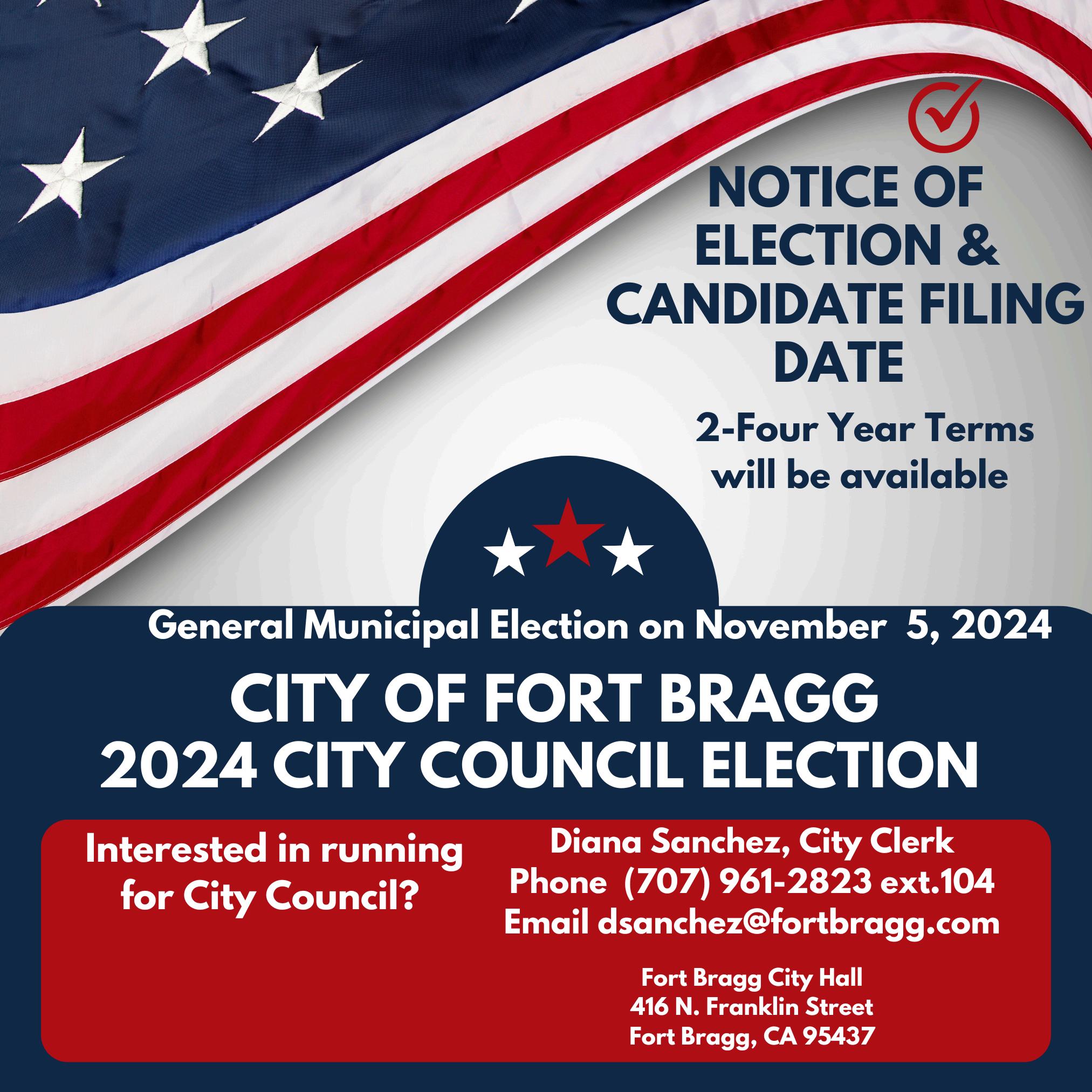 The Candidate Filing Period will be from July 15, 2024, to August 9, 2024. For more information, please contact City Clerk, Diana Sanchez, at dsanchez@fortbragg.com or 707-961-2823 ext.104.