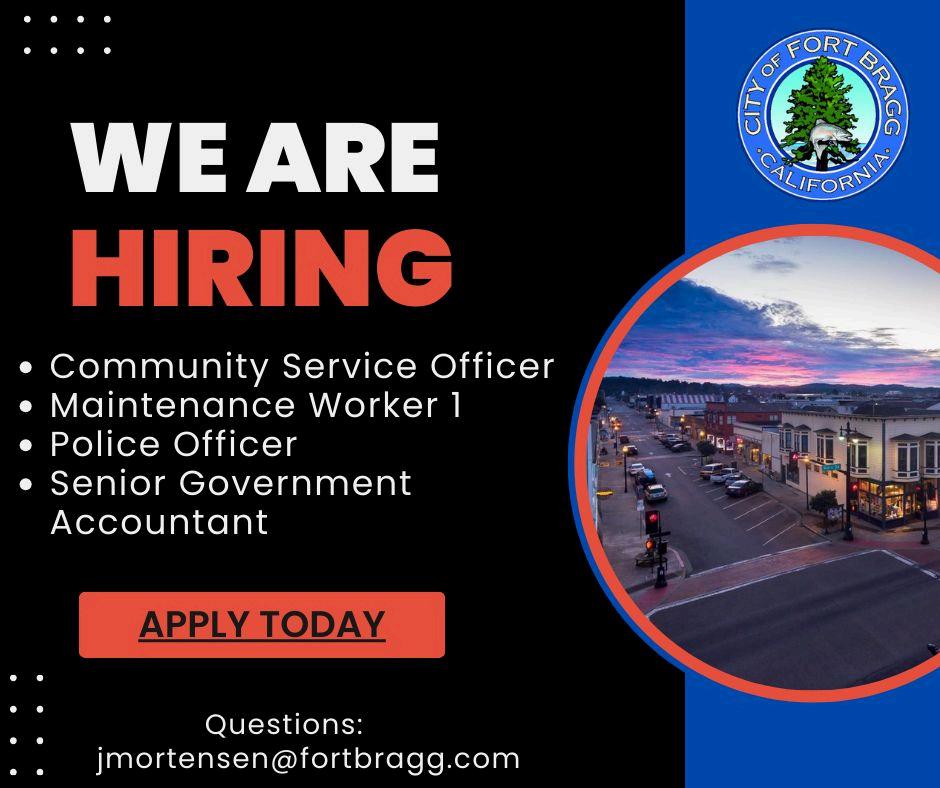 We celebrate the dedication and hard work of our city employees, who tirelessly contribute behind the scenes Their commitment is crucial to the city's functioning, meriting our utmost appreciation and acknowledgment This month, we look to the Community Development Department to select our May Employee Spotlight for their exceptional contributions CITY OF FORT BRAGG - IS HIRING CITY OF FORT BRAGG - IS HIRING