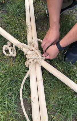 the canvas, and the intended environment and use. The process of assembly also changes over time as the tipi materials themselves age. We needed to identify our tripod poles, our lifting poles, learn to tie a clove hitch, how to work as a team as each pole went up, fight with the lacing pins to secure the two sides of the tipi together, among other steps. Rather than following stepby-step instructions, it was an ongoing process of seeing what felt and looked right and making tiny adjustments along the way, a process that my type-A linear brain really struggled with. We still