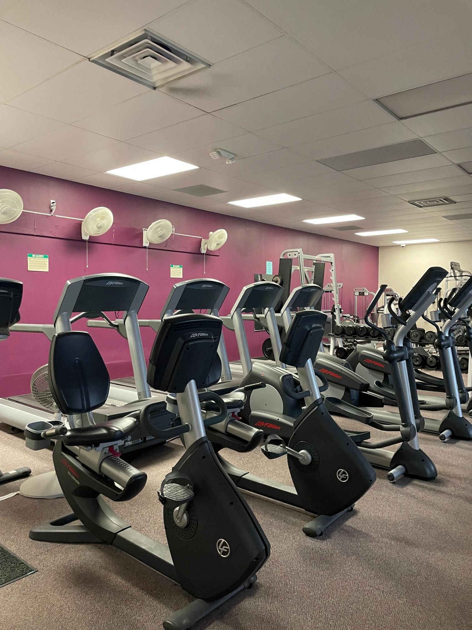 Treadmills, elliptical, bicycles (upright & recumbent), weight training machines, free weights, and TVs