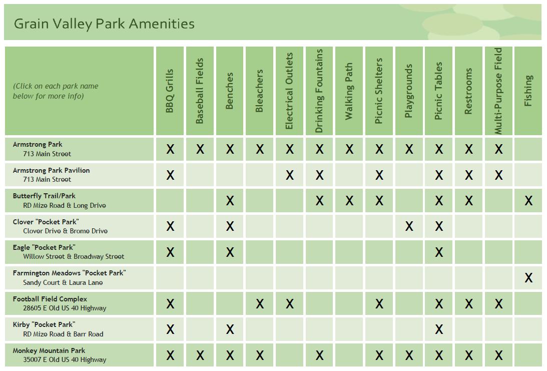 Grain Valley has four "pocket parks" nestled back in the middle of housing developments; Clover Park, Eagle Park, Kirby Park, and Farmington Meadows Park.