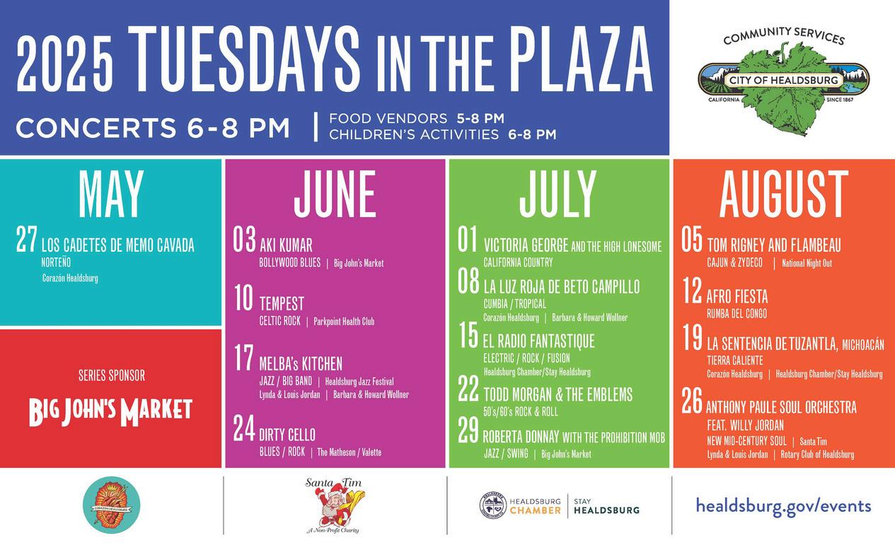 Tuesdays in the Plaza continue Tuesday, July 15 with El Radio Fantastique! Join us every Tuesday evening till August 26 in the Healdsburg Plaza for a season of unforgettable live music, community spirit, and summer fun. Starting at 5:00 pm, enjoy mouthwatering bites from a variety of local food vendors. Bring your friends, family, and picnic blankets—Tuesdays in the Plaza is free, fun, and open to all! th
