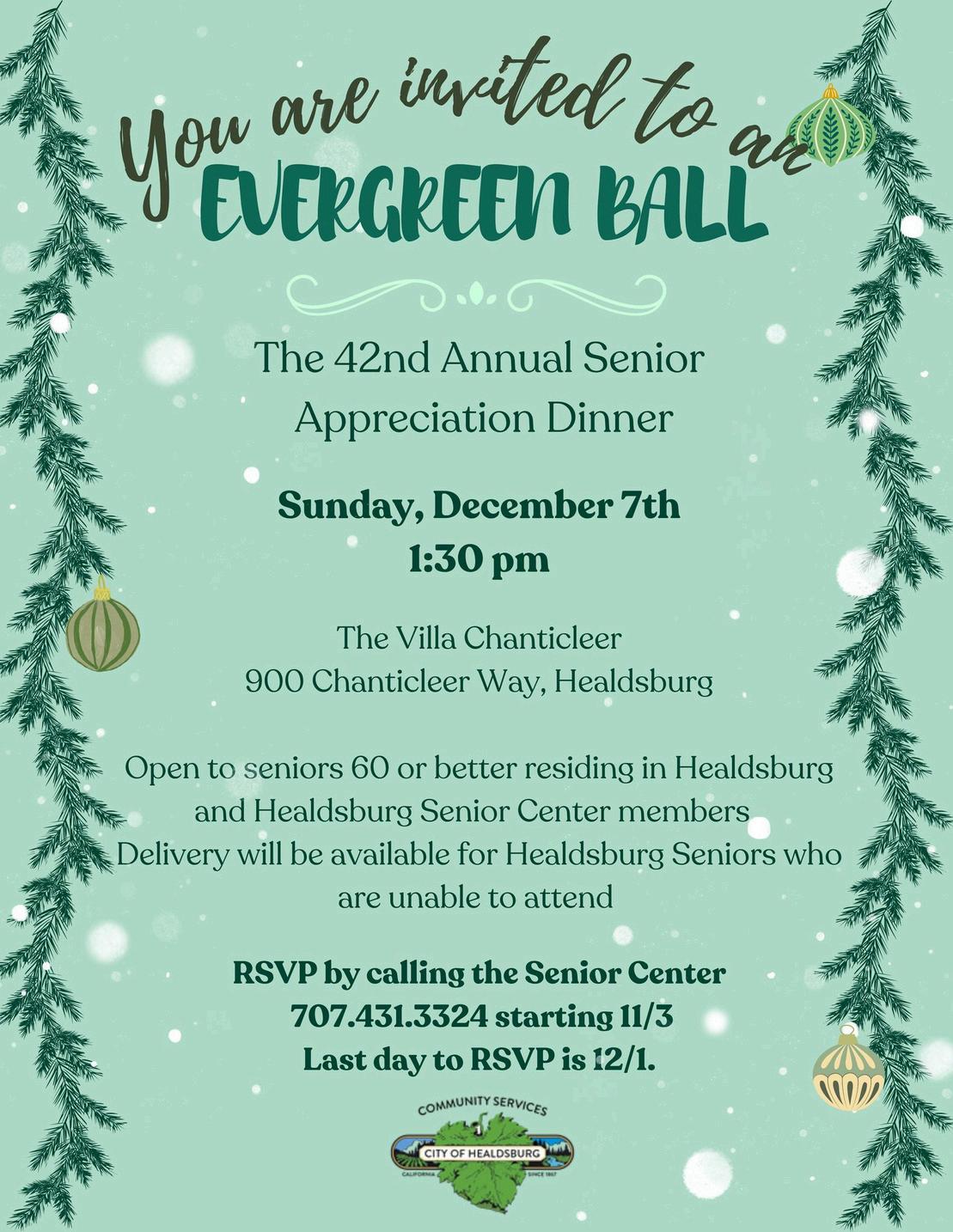 Appreciation Dinner, themed “Evergreen Ball.” The event will take place at the Villa Chanticleer on Sunday, December 7th, from 1:30 p.m. to 5:30 p.m.