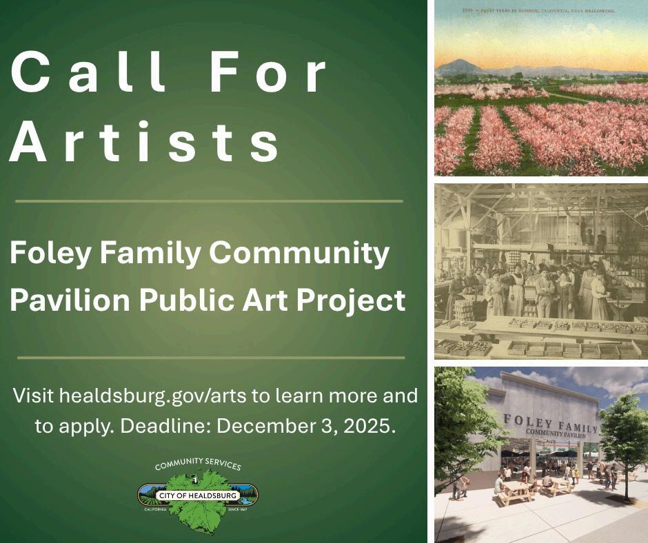 The City of Healdsburg - through its Arts and Culture Commission - is issuing a Request for Qualifications (RFQ) to find the right artist to create a public art installation for the new Foley Family Community Pavilion. We are looking for an artist who can create a 2D or 3D artwork that reflects and celebrates the local community and its agricultural history and traditions. The installation should be integrated with the site, increase awareness of historical importance of agriculture to the area, celebrate our community, and may also be functional in the new space. The art form should be visual but may be expressed in any medium including painting, photography, sculpture, technology, etc. The project budget is $45,000.