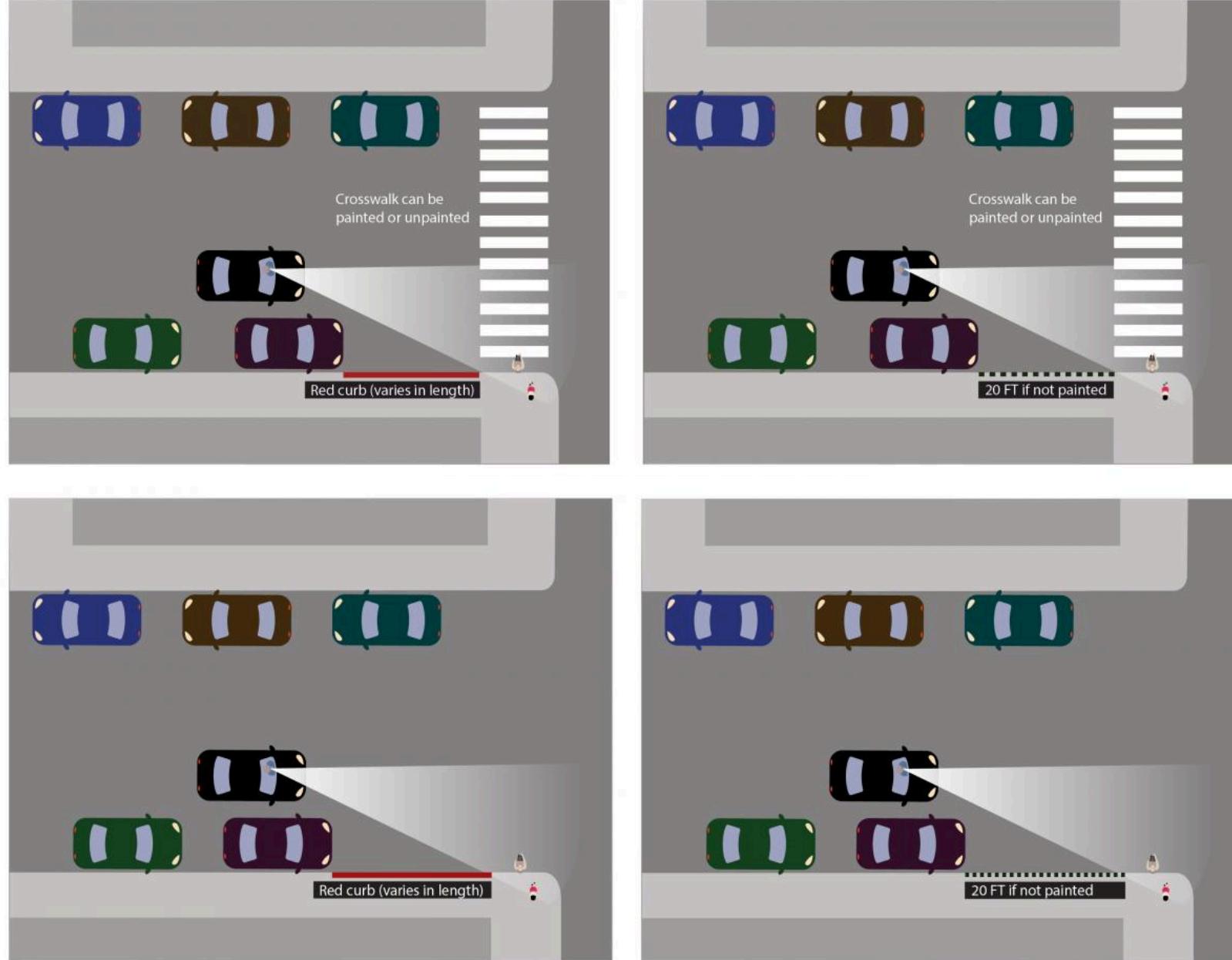 La nueva ley prohíbe estacionarse a menos de 20 pies de un cruce peatonal marcado o no marcado en el lado de acceso de la calle (15 pies si hay extensiones de acera), independientemente de si la acera está pintada de rojo. Para ayudar con la seguridad y el cumplimiento de la nueva ley de iluminación natural, la ciudad de Healdsburg está pintando bordillos rojos en varias calles. Las siguientes gráficas muestran ejemplos de cómo se aplican la ley de iluminación natural y las aceras rojas en las intersecciones.