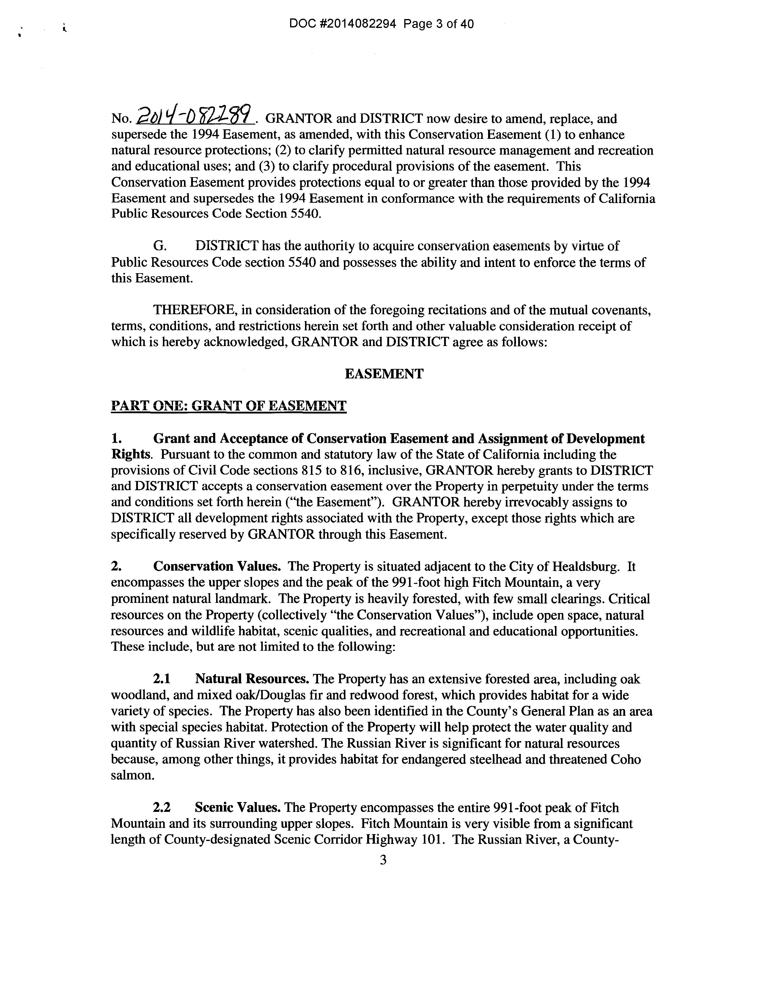 The acquisition of Fitch Mountain was a priority for both the District and the City for decades (Coastal Conservancy 20152). The District first purchased a “Forever Wild” conservation easement (1994 Easement) over a portion of the mountain and what is now the Preserve in September 1994. The negotiations between the District and owners provided for future public use of the land by including a permitted use in the 1994 Easement “to convey all or a portion of the property to the City of Healdsburg or other willing park or open space entity for the purpose of a park.” The District attempted to purchase the 146-acre property in fee in early 2003, but negotiations failed and it was sold to a private party. The District worked with the new property owner and developed a purchase and sale agreement in 2012.
