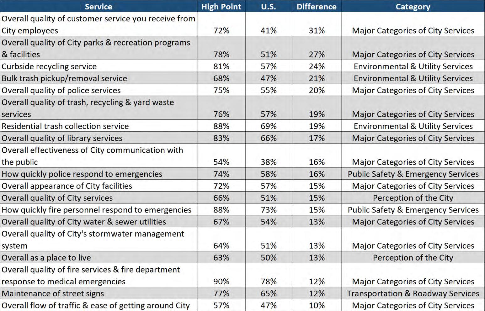 Service High Point Atlantic Region Difference Category Overall quality of customer service you receive from City employees 72%38%34% Major Categories of City Services Overall quality of City parks & recreation programs & facilities 78%50%28% Major Categories of City Services Bulk trash pickup/removal service 68%44%24% Environmental & Utility Services Curbside recycling service 81%65%16% Environmental & Utility Services Overall quality of police services 75%63%12% Major Categories of City Services Overall quality of City services 66%54%12% Perception of the City Overall quality of library services 83%72%11% Major Categories of City Services Overall quality of trash, recycling & yard waste services 76%65%11% Major Categories of City Services Overall appearance of City facilities 72%61%11% Major Categories of City Services Residential trash collection service 88%77%11% Environmental & Utility Services