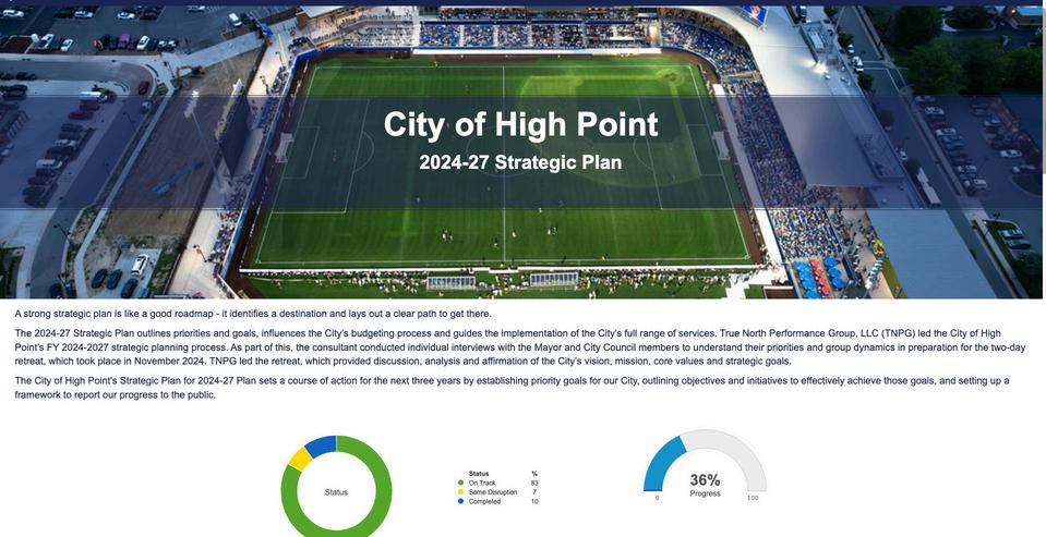 The City of High Point has launched a new public-facing strategic plan dashboard designed to give residents, business leaders and community stakeholders a glimpse of how the City is performing across key priorities. The dashboard is part of a commitment to transparency, accountability and results-orientation, allowing users to explore progress on goals, metrics, initiatives and departmental efforts that align with the City’s strategic plan.