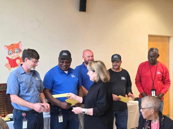 At this meeting, the Friends of the Library recognized the library’s maintenance staff members with the Friends of the Year Award: Eugene Albertson, Mitchell Humphries, Wilfrid Louve, Lane Smith, and Glenn Williams.