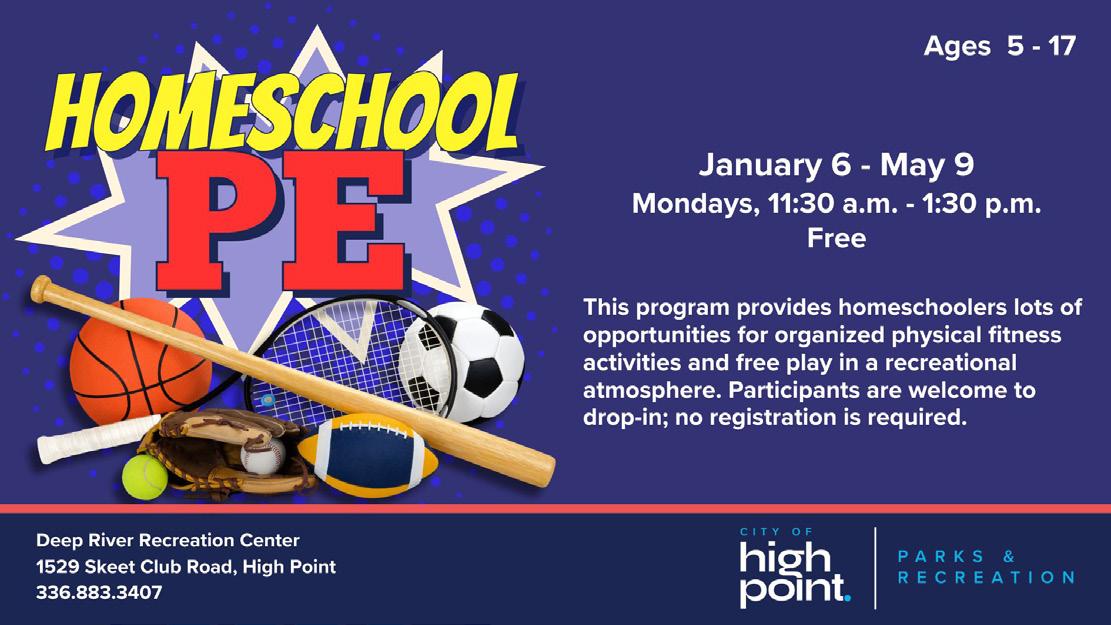 ASPIRE will offer a series of leisure and recreational activities in a safe space for people with disabilities, including adaptive art forms, gym games, exercise techniques and fun social experiences. Registration is not required. For more information, please contact Timpani Troxler at timpani. troxler@highpointnc.gov or call 336.883.3483.