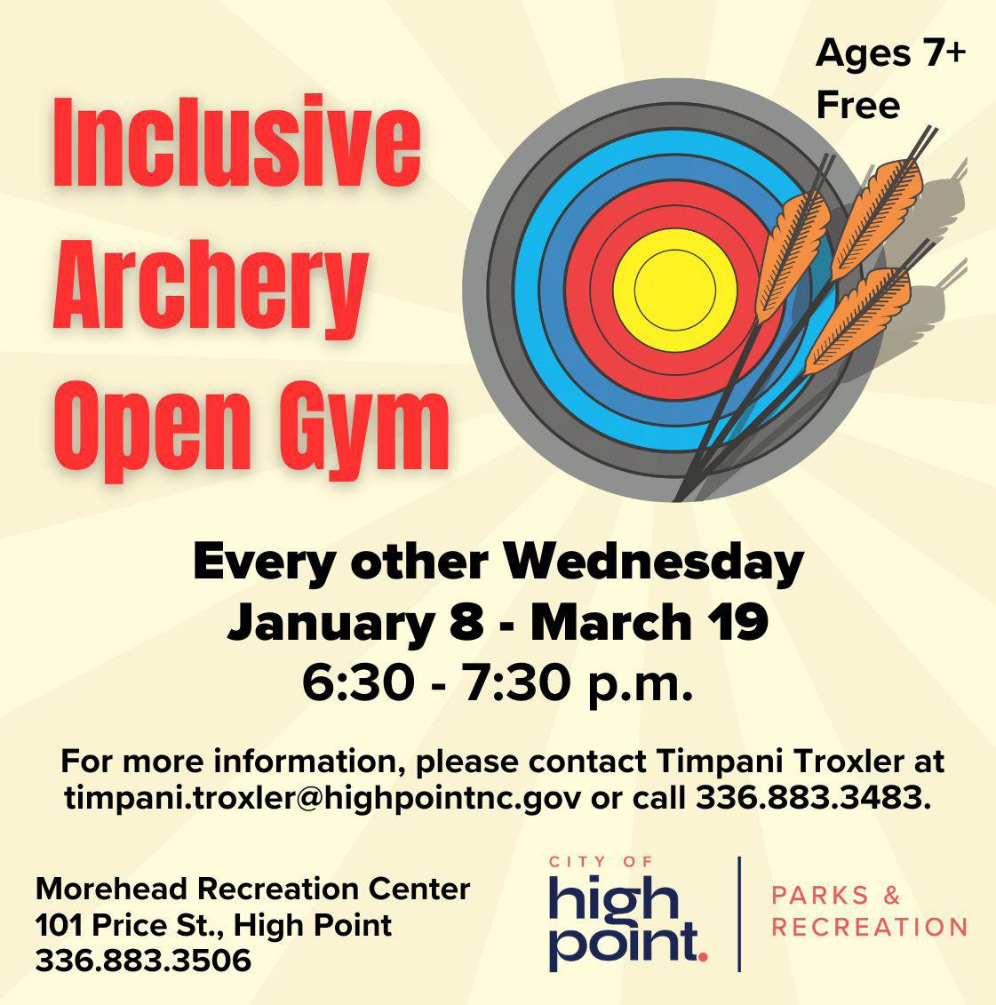 Participants will learn the basic fundamentals of archery, play archery games and even pop some balloons! Adaptive equipment is available, and no previous experience is needed. For more information, please contact Timpani Troxler at timpani.troxler@highpointnc.gov or call 336.883.3483.