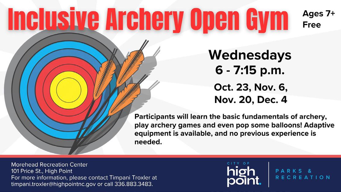 Participants will learn the basic fundamentals of archery, play archery games and even pop some balloons! Adaptive equipment is available, and no previous experience is needed. For more information, please contact Timpani Troxler at timpani.troxler@highpointnc.gov or call 336.883.3483.