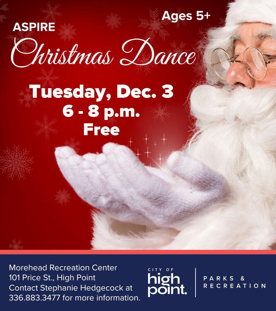Our ASPIRE Christmas dance for people with disabilities, their families and friends is a longstanding and well-loved tradition! For more information, please email Stephanie Hedgecock at stephanie.hedgecock@highpointnc.gov or call 336.883.3477.