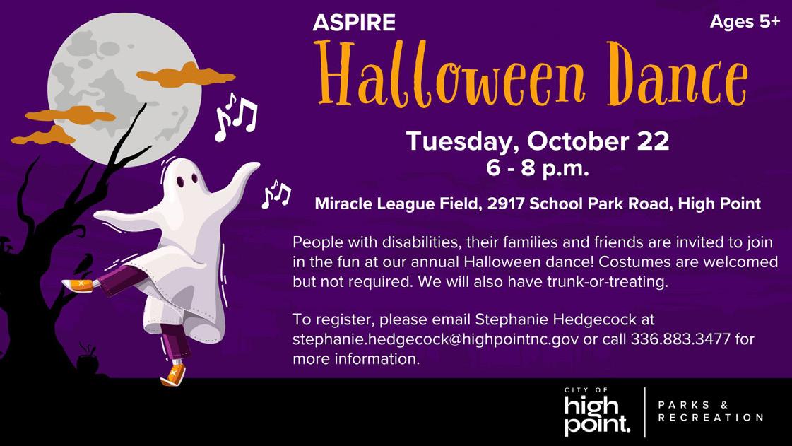 People with disabilities, their families and friends are invited to join in the fun at our annual Halloween dance! Costumes are welcomed but not required. We will also have trunk-ortreating. For more information, please email Stephanie Hedgecock at stephanie.hedgecock@highpointnc.gov or call 336.883.3477.