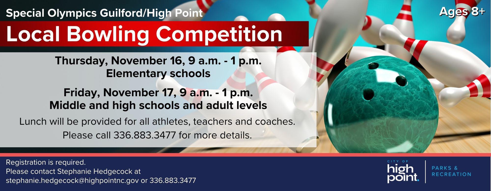 This is a Special Olympics bowling competition for local school athletes and adult athletes. Elementary schools will compete on Nov. 16. Middle and high school and adult levels will compete on Nov. 17. Lunch will be provided for all athletes, teachers and coaches. Please call 336.883.3477 for more details.