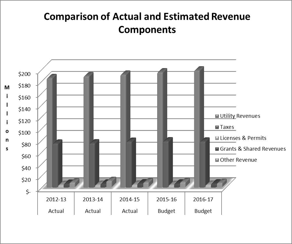 Source Adopted Budget 2015-16 Revised Estimate Adopted Budget 2016-1 7 Property Taxes $ 7,516,500 $ 7,556,184 $ 7,561,000 Sales & Use Taxes 17,570,404 18,196,194 18,352,500 Utility Franchise Fees 11,369,000 8,876,109 9,107,000 PILOTS 18,868,596 18,530,344 19,103,195 Licenses & Permits 3,403,687 3,377,293 3,759,869 Grants & Shared Revenues 5,275,139 5,299,615 5,289,812 Charges for Services 2,020,770 1,954,406 2,002,725 Fines & Court Costs 4,921,960 4,023,000 3,623,000 Interest Income 95,900 96,500 101,500 Interfund Charges 4,741,289 4,741,289 5,073,016 Other Revenue 519,000 463,000 468,000 Total Revenue $76,302,245 $73,113,934 $74,441,617