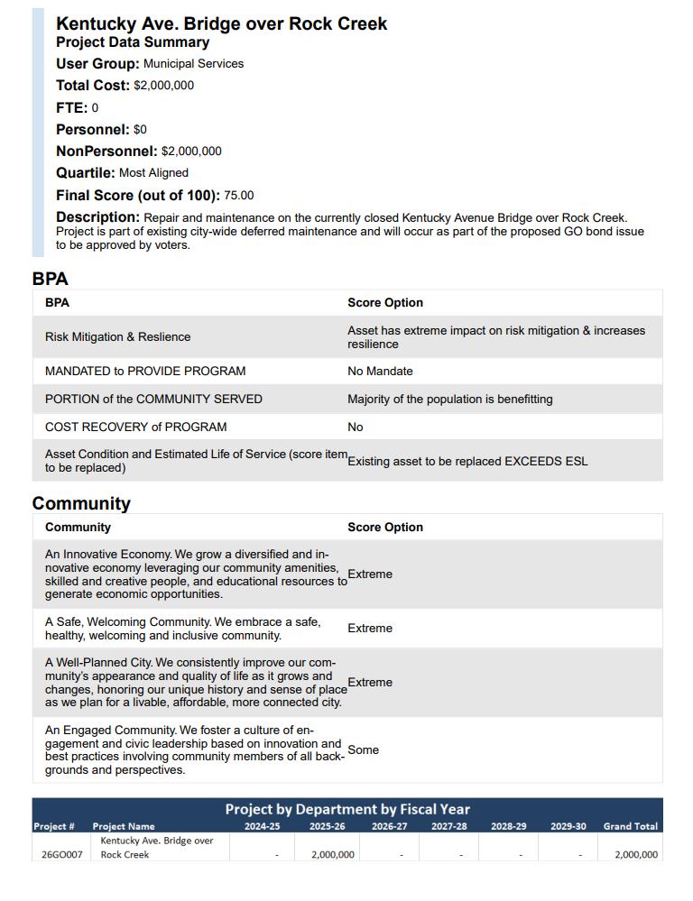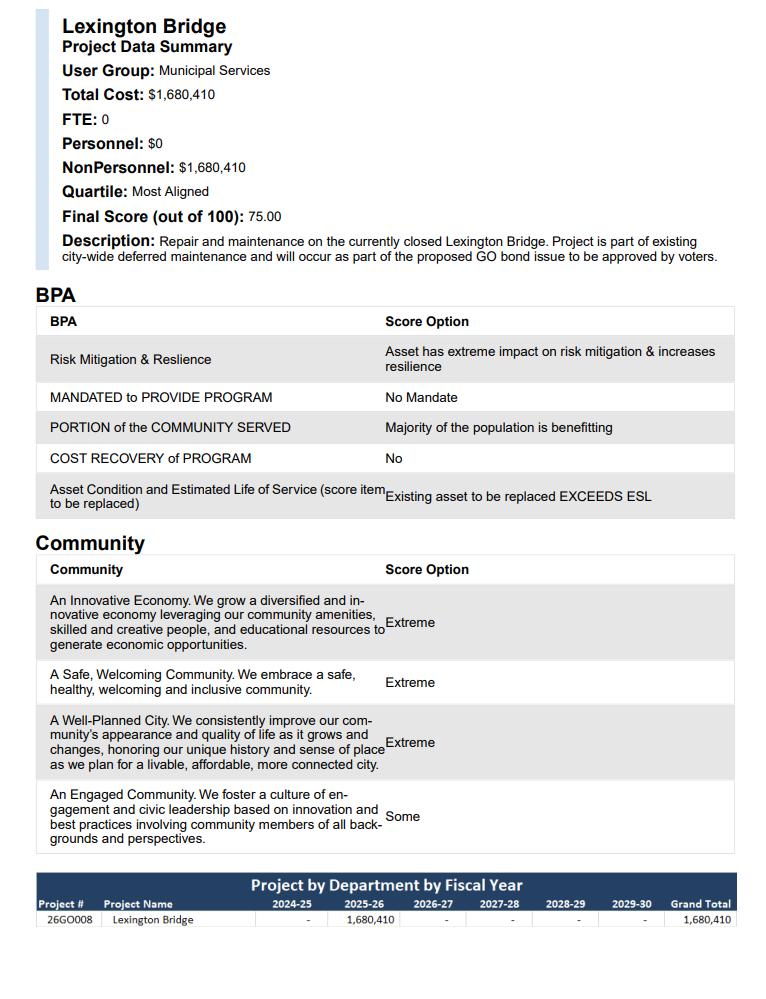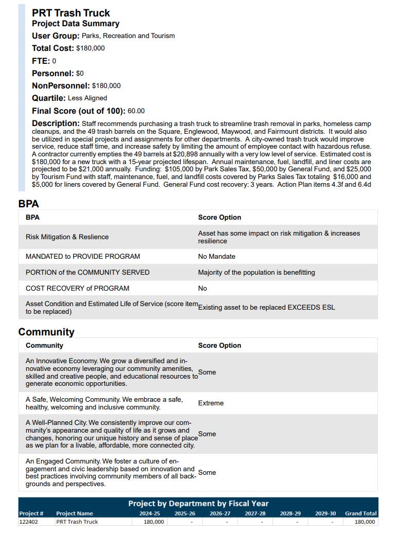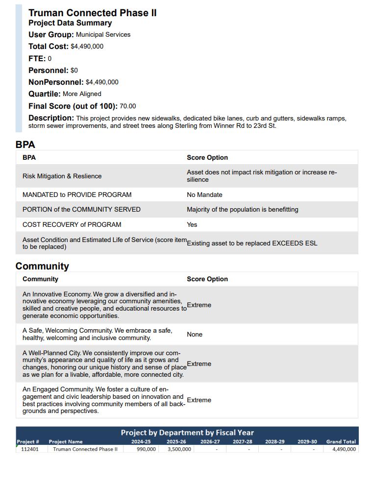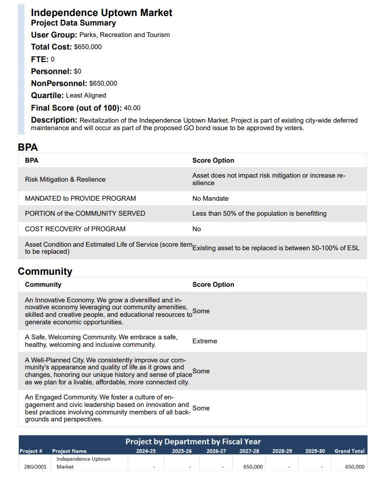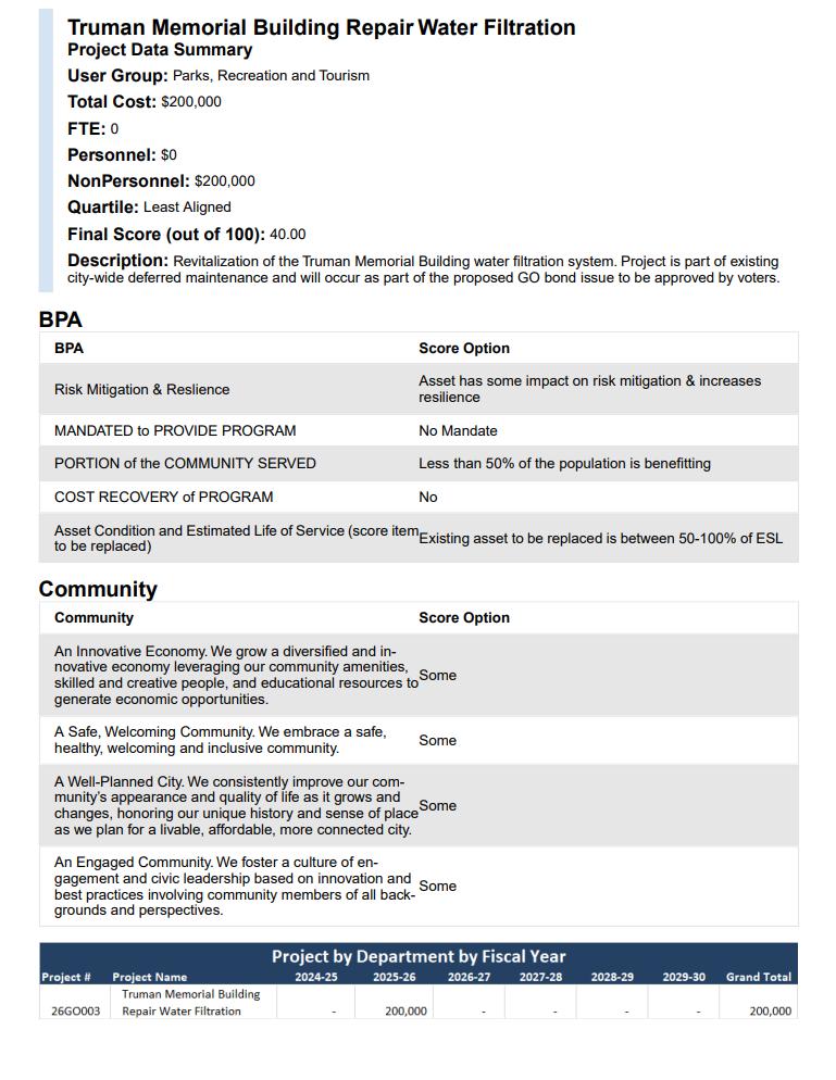 • Structured the submitted budget to reflect the option of Tourism being separated from the Parks & Recreation Department. Tourism includes the operation and maintenance of historic sites, museum, Truman Memorial Building, Main Street 1849, marketing, and visitor’s guide production. As this was our first year utilizing Priority Based Budgeting, I will note that historic sites rated as the most expensive and least aligned operation with the Parks & Recreation Department.