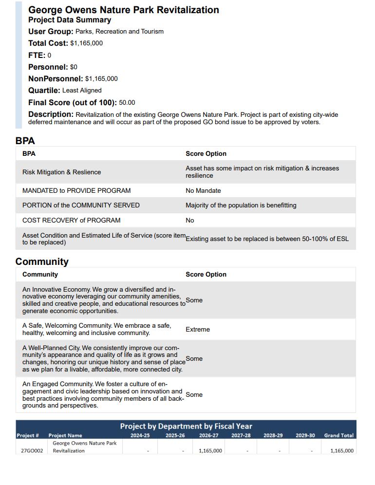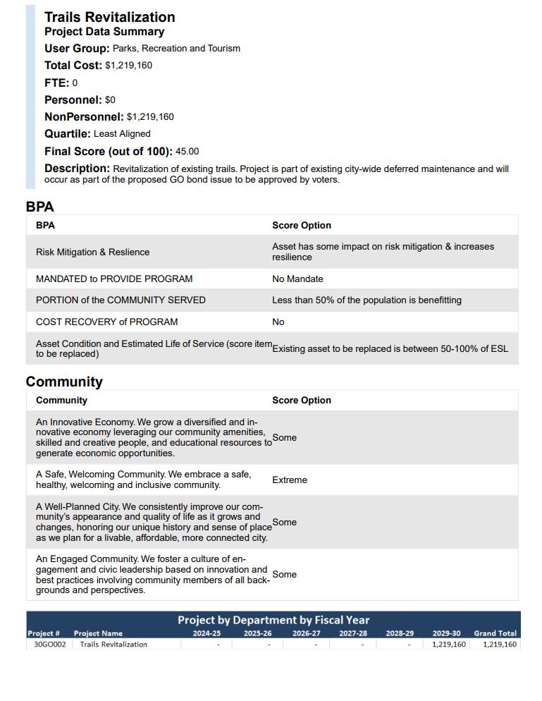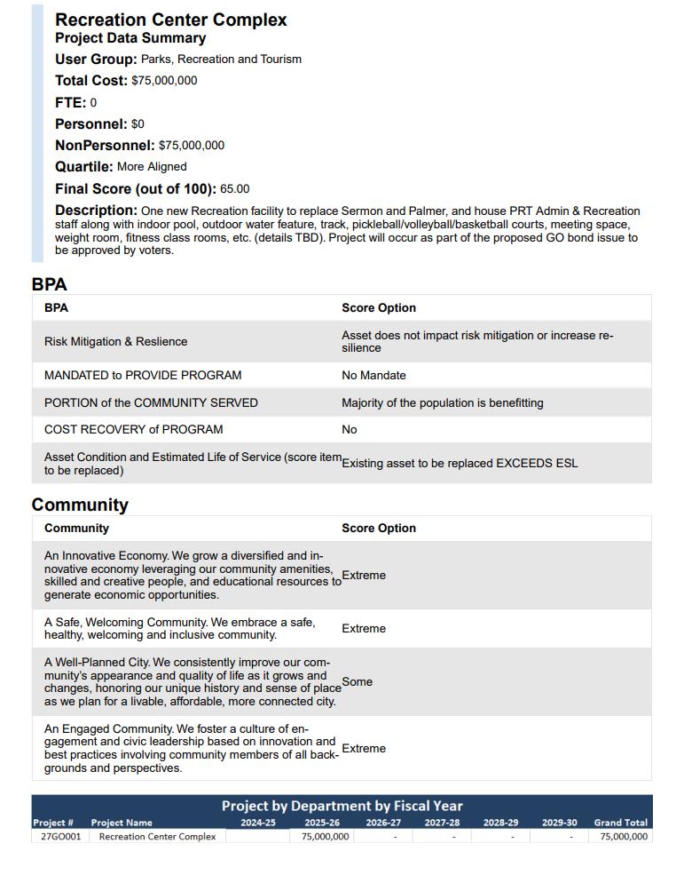 Current operating costs are not sustainable given increasing internal service costs, higher personnel service costs, and inflationary expenditure costs. To compensate for these increasing costs, the department is implementing a Reduction in Force impacting 8.7 full-time equivalent positions, or 10.3% of the total PRT staff. Current capital project costs for the Park Improvement Sales Tax Fund and the Tourism Fund are also not sustainable for the long term. Additional revenue streams are needed.