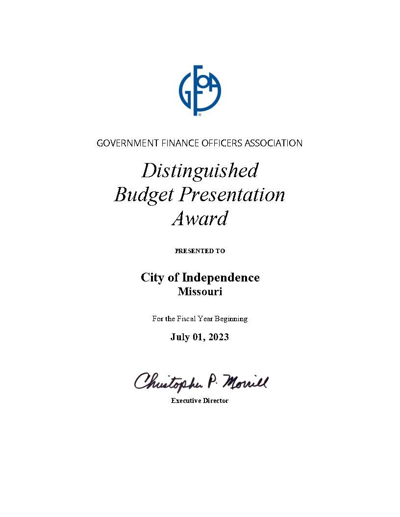 TheGovernmentFinanceOfficersAssociationoftheUnitedStatesandCanada(GFOA)presenteda DistinguishedBudgetPresentationAwardtotheCityofIndependencefortheannualbudgetbeginning July2023.Inordertoreceivethisaward,agovernmentalunitmustpublishabudgetdocumentthat meets program criteria as a policy document, an operations guide, a financial plan, and a communicationdevice.