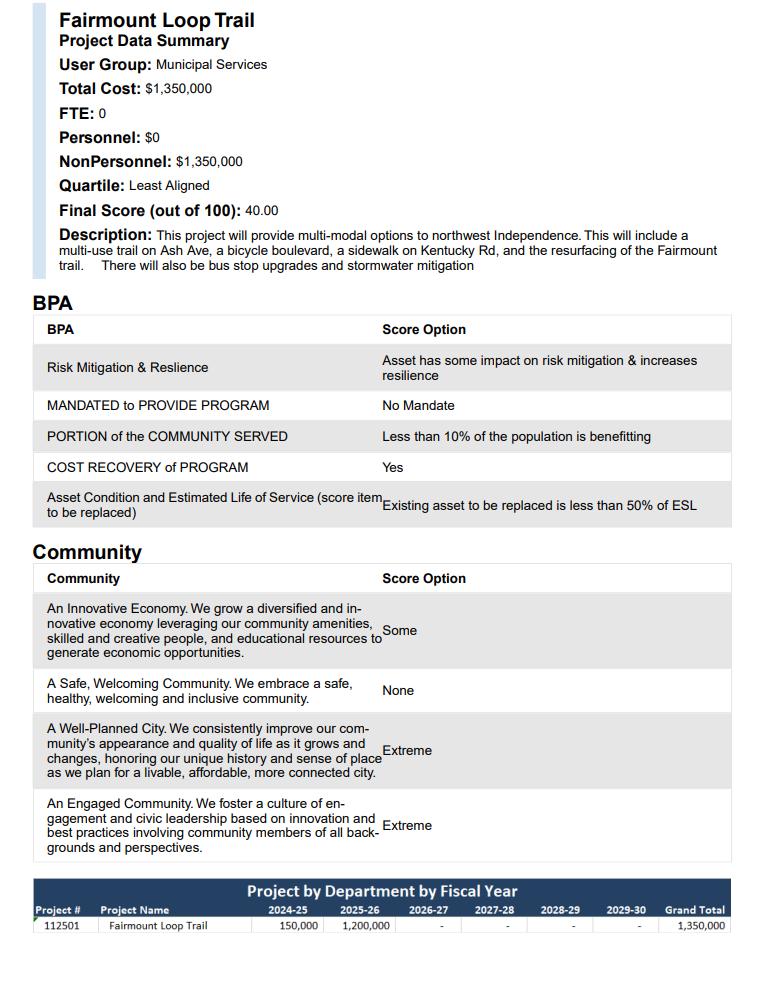 Continued stabilization of the City’s fiscal condition will require additional efforts to critically examine and prioritize services, evaluate revenue options, as well as focus on attracting capital investment and other initiatives that contribute to the economic expansion of Independence.