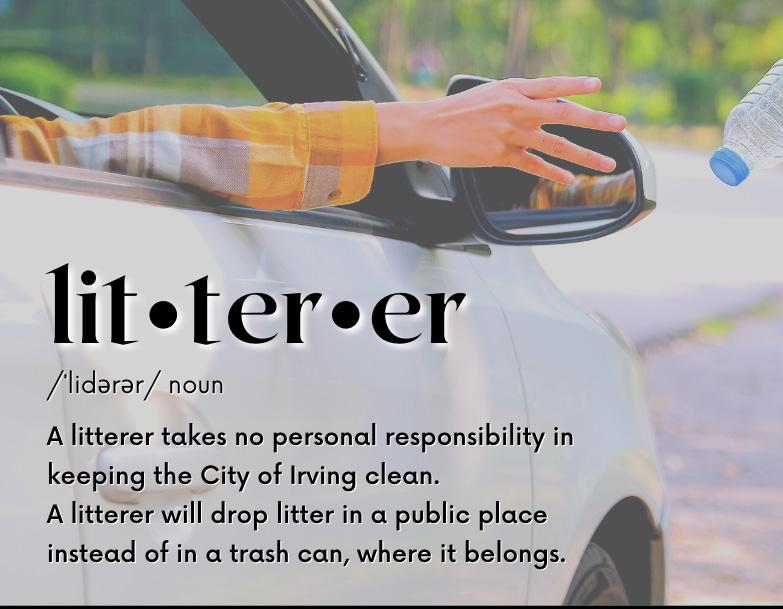 A litterer is a person who only has one mission: to ruin Irving’s outdoors. Picture it: an afternoon stroll through one of Irving’s beautiful parks or open spaces when photographic inspiration strikes. And just as the “share” button is tapped, it’s spotted … litter! A litterer ruined another Instagram moment! This summer remember, no litterers allowed!