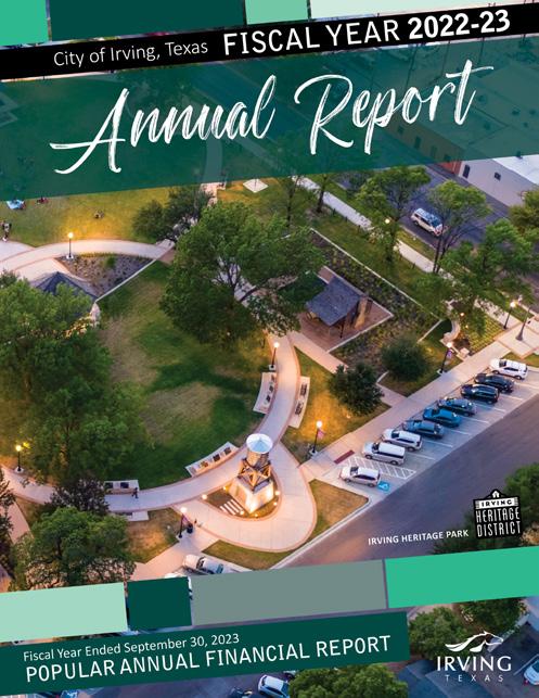 The City of Irving Fiscal Year 2022-23 edition of the Popular Annual Financial Report (PAFR) is available online and in print at Irving City Hall, 825 W. Irving Blvd. The Annual Report presents the city’s financial position, accomplishments and activities in an easy-to-read format. This edition highlights the city’s operations and work throughout the year, as well as future projects, strategic plans and goals. The PAFR can be accessed online at CityofIrving.org/PAFR