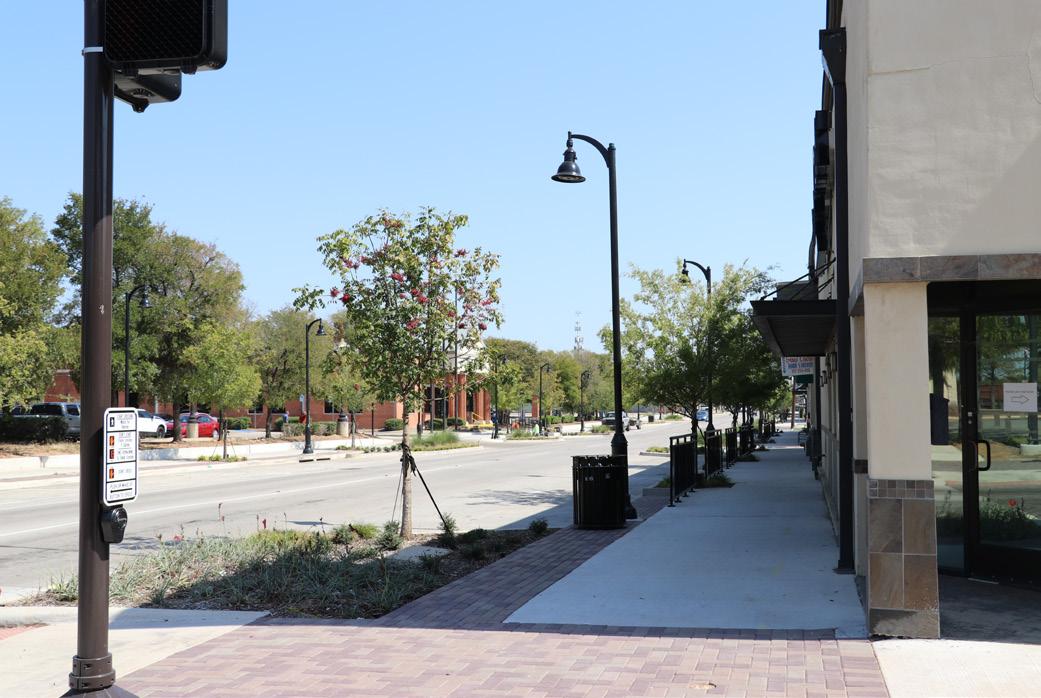 Fresh pavement striping along Irving Boulevard provides the two lanes of traffic with a new, clean aesthetic. While there is not a designated bike path, traffic lanes are now wide enough for vehicle and bicycle traffic. Additionally, all sidewalks have been installed and connected, along with Americans with Disabilities Act (ADA) compliant rails, providing more access to the area.