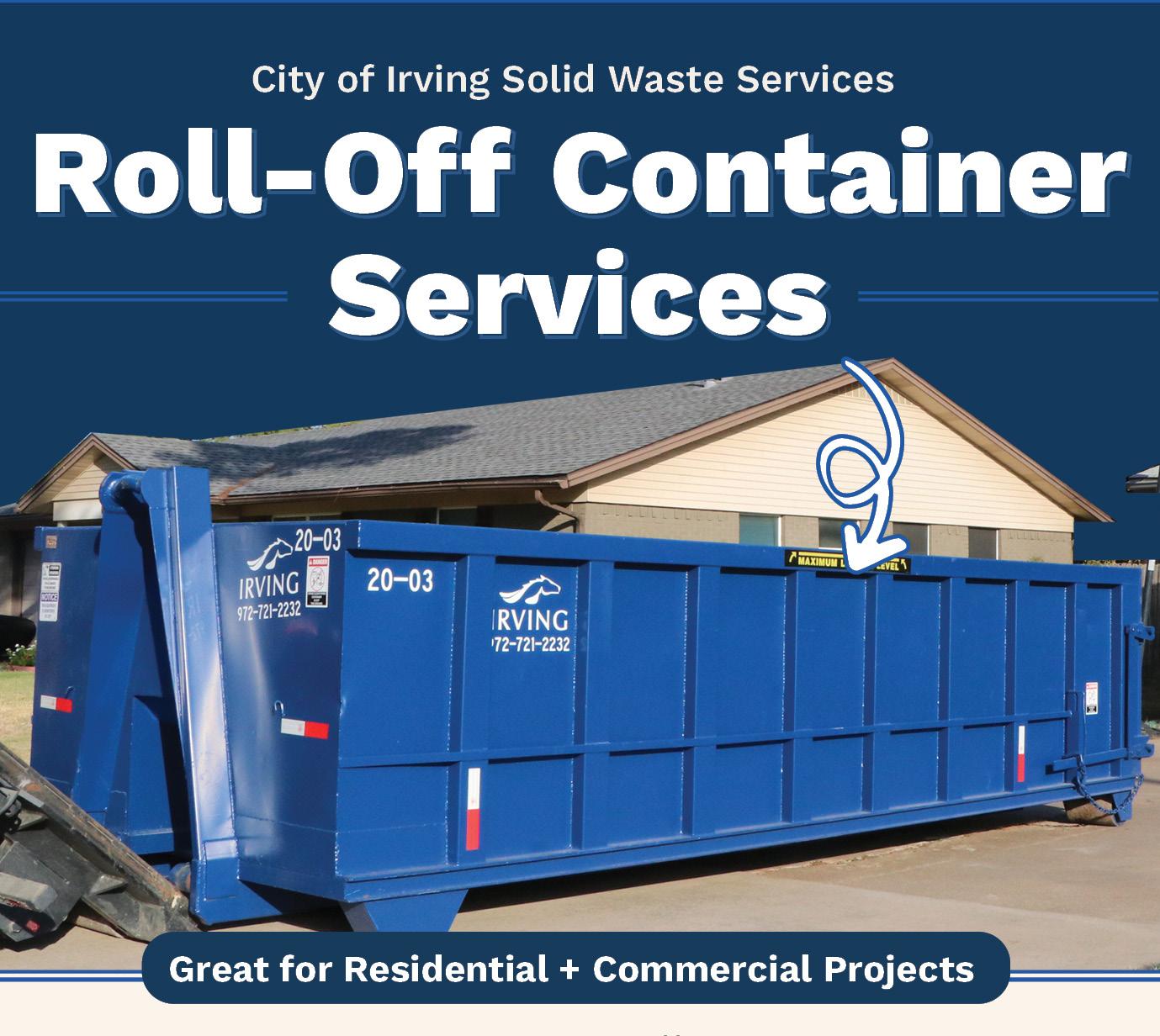 For more information, call (972) 721-2232 or visit IrvingTX.gov/Roll-Off-Service