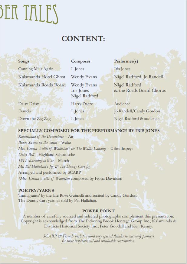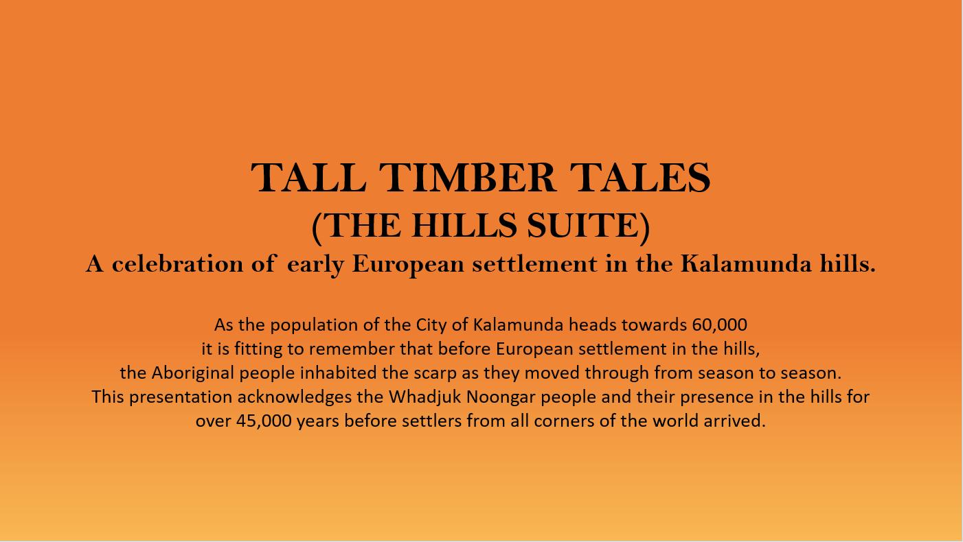 Candy Good morning, everyone SCARP and friends welcome you to this celebration of Tall Timber Tales All the music, songs and poetry you will hear today were inspired by the hard work and tenacity of our early European settlers, especially those who worked in the fledgling timber industry. Our story today focuses on life amongst the tall timbers of the jarrah forests on the Darling Scarp.