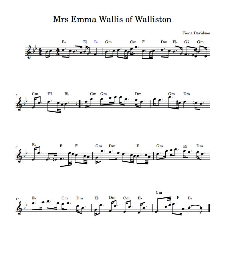 The area surrounding Wallis Landing became Walliston in later years in acknowledgement of their pioneering efforts. The next two pieces of music, both strathspeys, are dedicated to John and Emma. The first, Mrs. Emma Wallis of Walliston is followed by The Wallis Landing.