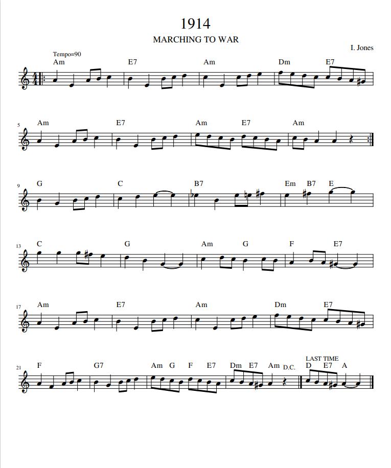 Piano only - a few bars of ‘Pack Up Your Troubles in…’ followed by SCARP - 1914 Marching to War.