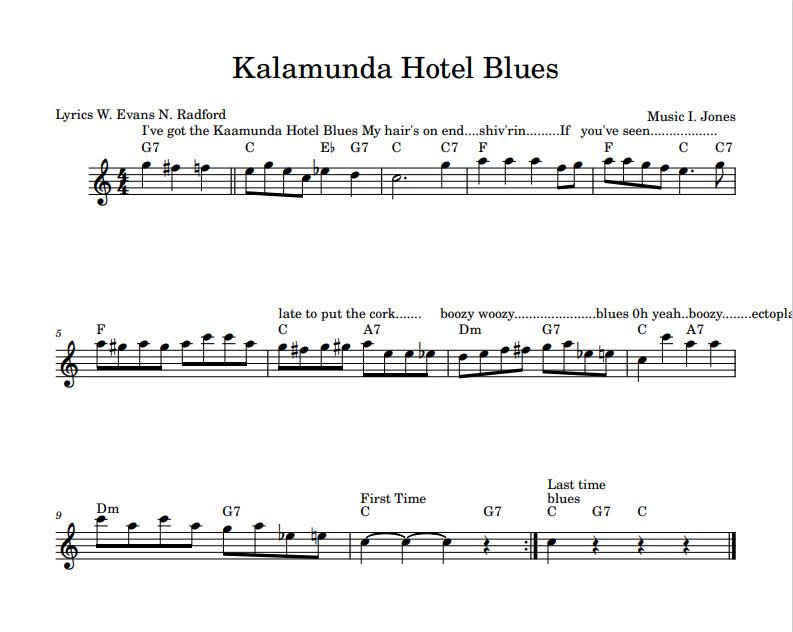 Copyright: Home Sweet Home – J.H. Payne & H.R. Bishop; Daisy Daisy - Harry Dacre; Mrs. Emma Wallis of Walliston – Fiona Davidson; Kalamunda Hotel Ghost – Wendy Evans; Immigrants – Rose Guimelli. Francis is adapted from a poem by J.F. McNamara, music Iris Jones. All other music, songs and lyrics, Iris Jones.