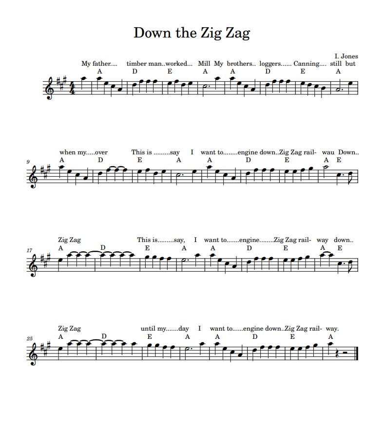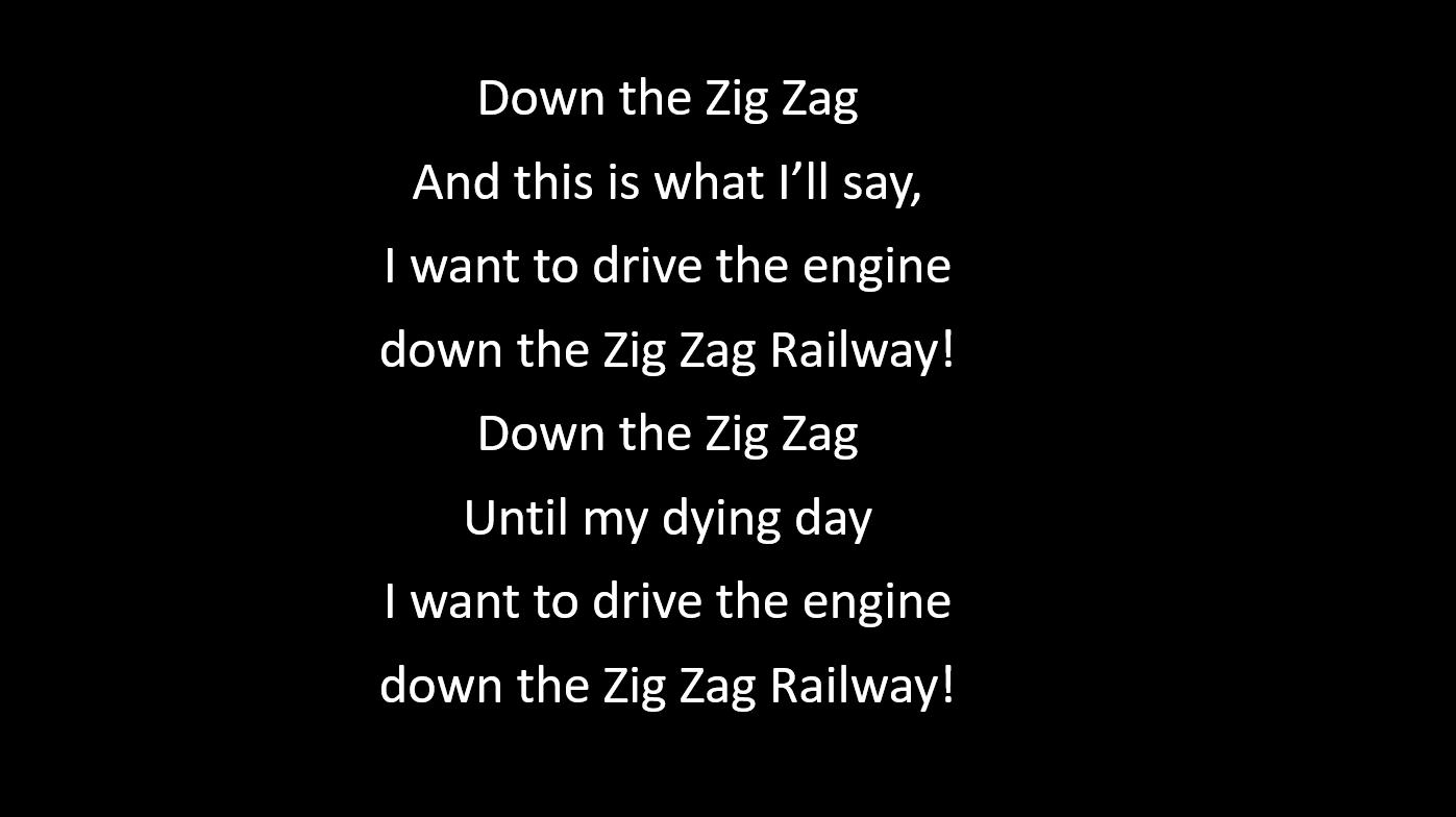 Chorus: Down the Zig Zag, this is what I’ll say I want to drive the engine down the Zig Zag Railway Down the Zig Zag, until my dying day I want to drive the engine down the Zig Zag Railway