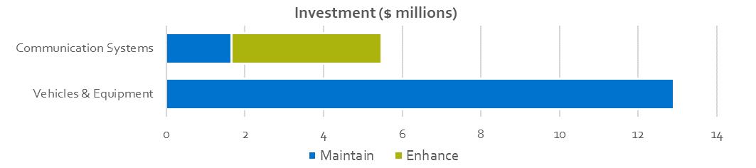 Fire. The well-established capital program at the Fire Department ensures fire trucks, equipment and communication systems remain up-to-date in order to keep firefighters and the community safe. It is a relatively small capital program as most costs are operational and fire stations are accounted for in the Buildings cost centre. Investment in the Fire cost centre is forecasted at $18 million. Big projects include: