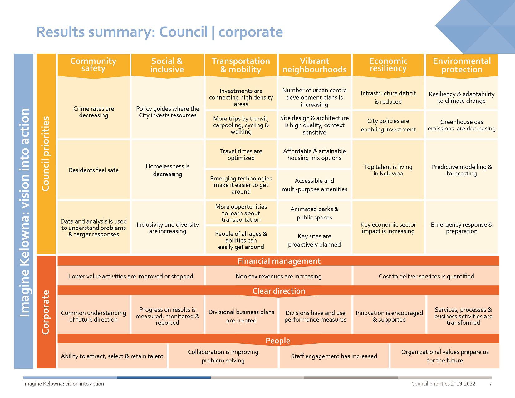 Kelowna is a thriving city and an incredible place to call home. To flourish in the future, we need to be agile, resilient and unafraid to do things differently. Through the Imagine Kelowna process, we heard loud and clear from the community that as we grow, we need to look out for one another and protect the stunning environment that sustains us. Our vision for an inclusive, welcoming, prosperous and sustainable future calls upon us all to be ambitious and embrace the challenges ahead. To help get us there, we have committed to deliver on Council’s Priorities 2019 - 2022. As Council, we will focus decisions and provide direction to staff for measurable results in six areas: community safety, social and inclusive, transportation and mobility, vibrant neighbourhoods, economic resiliency (which given our current crisis, is more important than ever) and environmental protection.